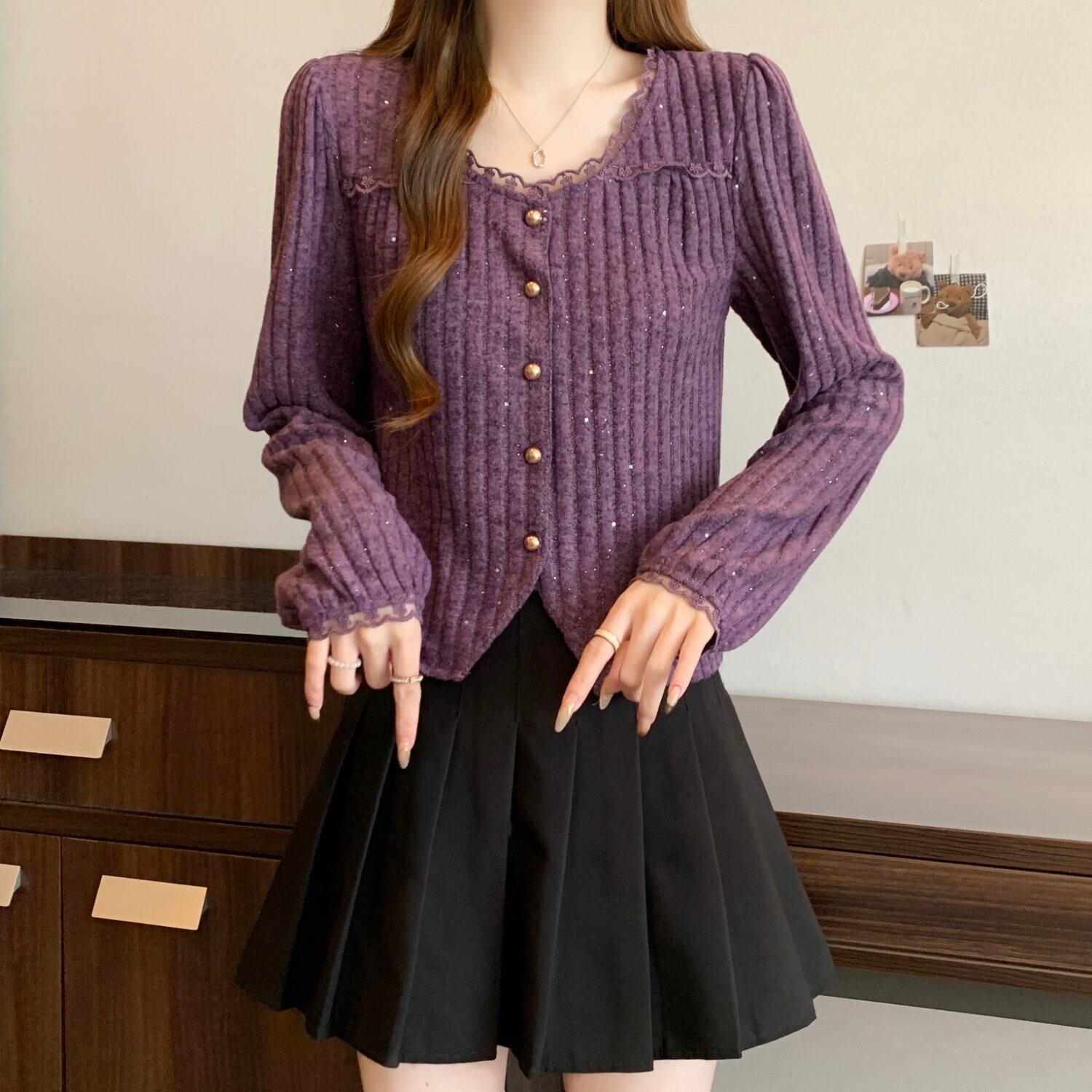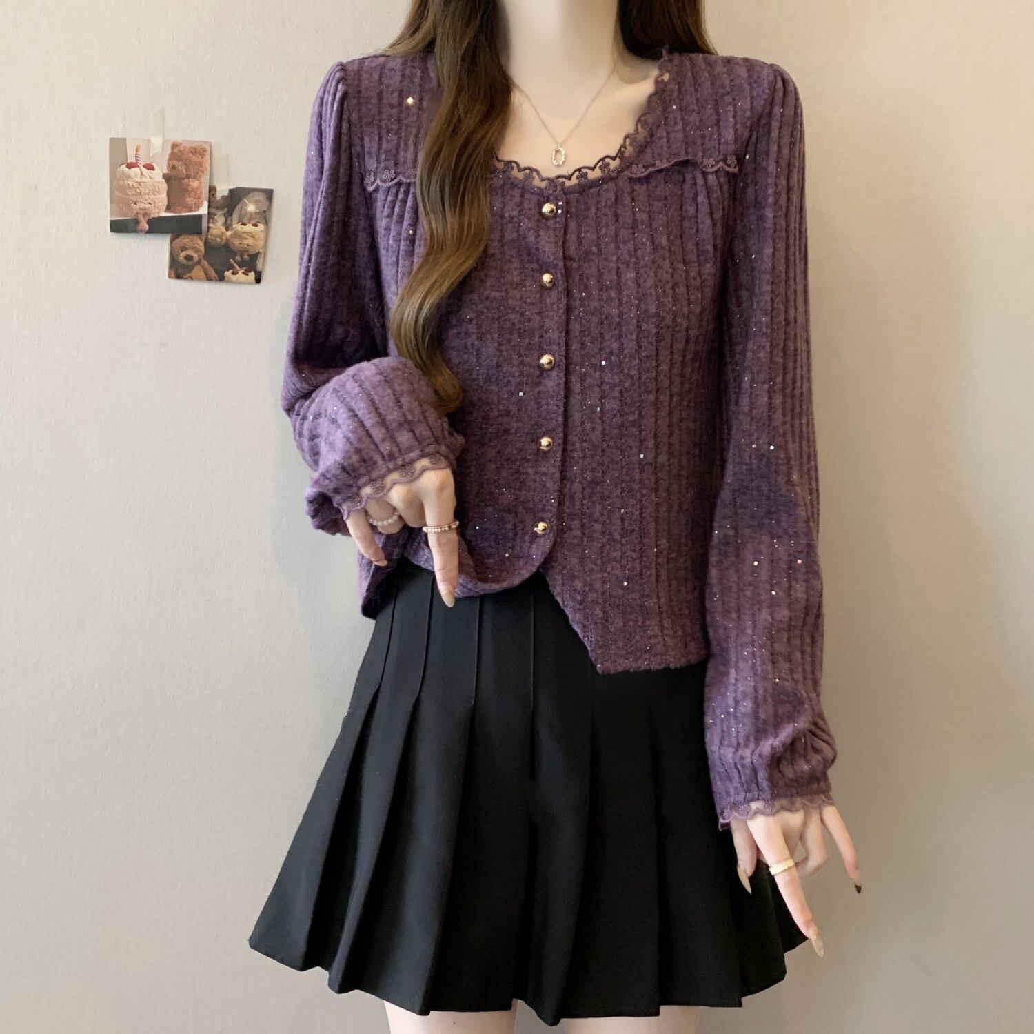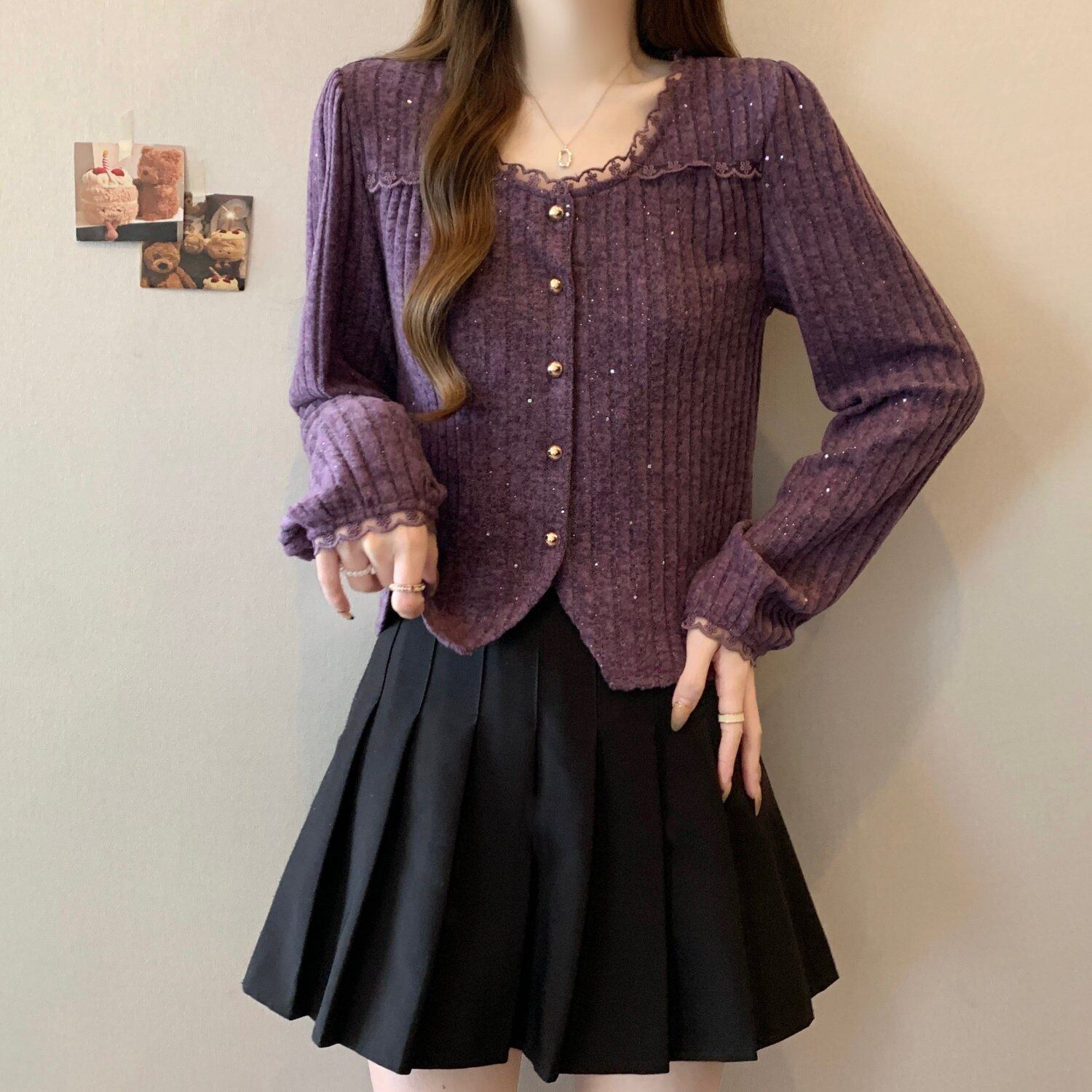 【送料無料】 レディース トップス ニット カーディガン カーデ 体型カバー 防寒 シンプル カジュアル きれいめ 大人かわいい こなれ感 スタイルアップ クルーネック パープル 紫 長袖 20代 30代 40代 通勤 通学 オフィス お出掛け 女子会 お呼ばれ 秋冬