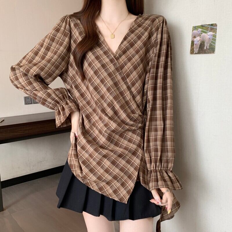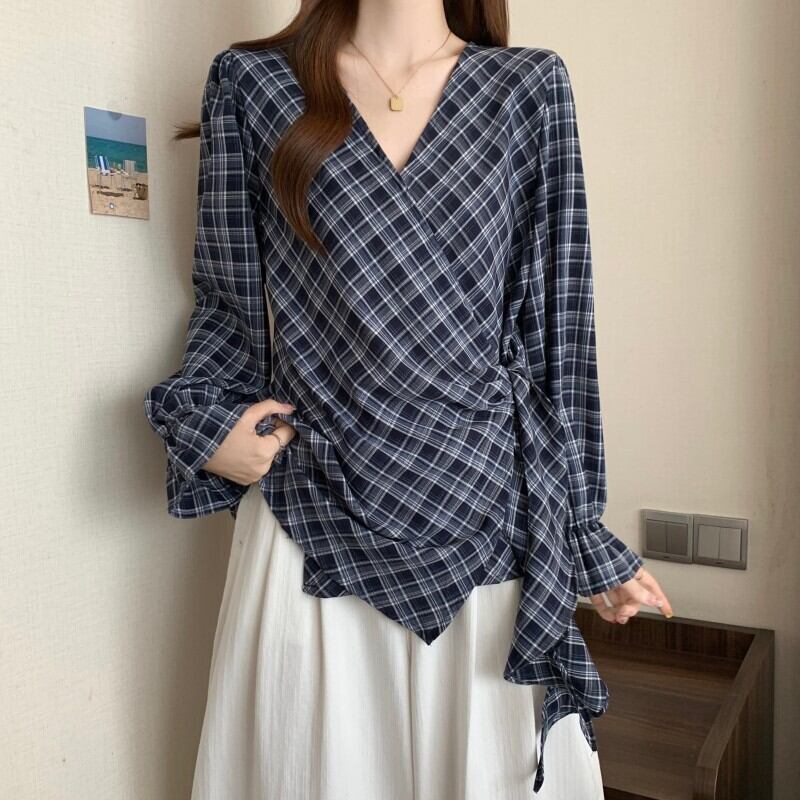 【送料無料】 レディース トップス ブラウス シャツ カシュクール風 アシンメトリー Vネック ふんわり袖 体型カバー 二の腕カバー こなれ感 大人可愛い 抜け感 長袖 チェック カーキ ネイビー 20代 30代 40代 通勤 通学 オフィス お出掛け 女子会 お呼ばれ 春秋冬