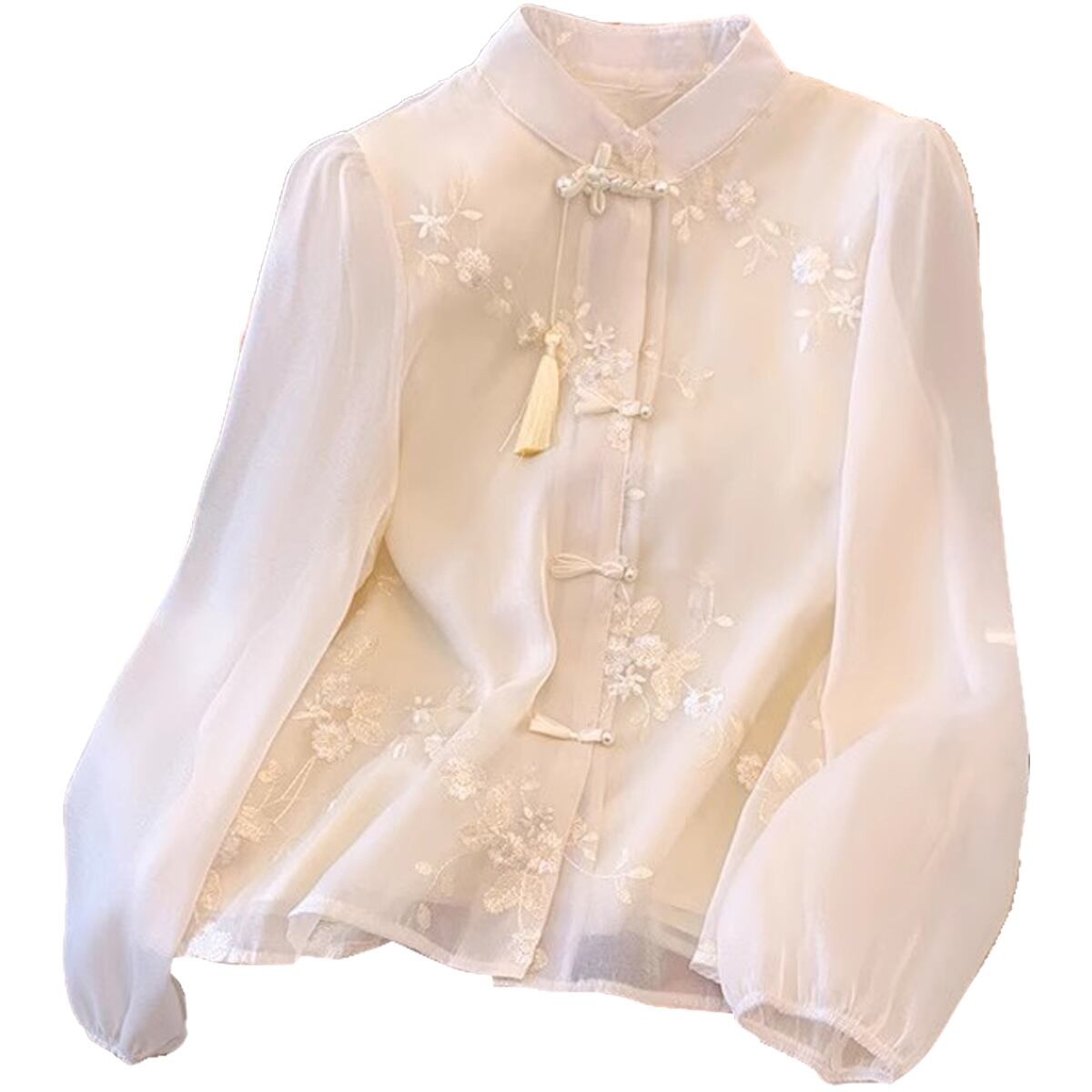 【送料無料】 レディース トップス ブラウス チャイナ風 アシンメトリー ふんわり袖 体型カバーシアー感 シンプル カジュアル きれいめ 大人かわいい こなれ感 フラワー 長袖 アイボリー 20代 30代 40代 通勤 通学 オフィス お出掛け 女子会 お呼ばれ 秋冬