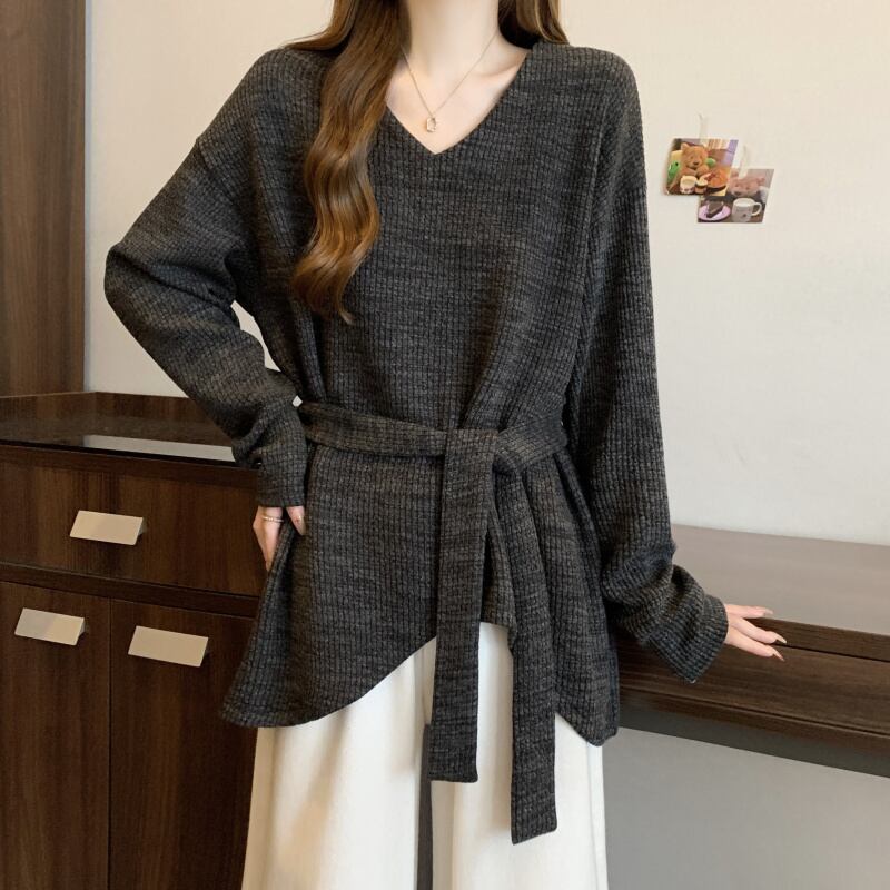【送料無料】 レディース トップス ニット Vネック ゆったり シンプル カジュアル こなれ感 体型カバー 二の腕カバー アシンメトリー リボン ウエストマーク スタイルアップ 抜け感 大人かわいい こなれ感 レトロ 長袖 カーキ ブラック 黒 20代 30代 40代 通勤 通学 オフィス お出掛け 女子会 お呼ばれ 秋冬