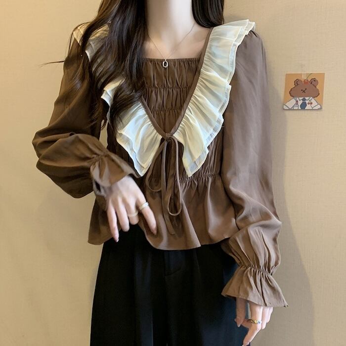 【送料無料】 レディース トップス カットソー レース スクエアネック フリル リボン スウィート シンプル カジュアル きれいめ ふんわり袖 体型カバー 二の腕カバー スタイルアップ キュート こなれ感 長袖 ブラウン ブラック 20代 30代 40代 通勤 通学 オフィス お出掛け 女子会 お呼ばれ 秋冬