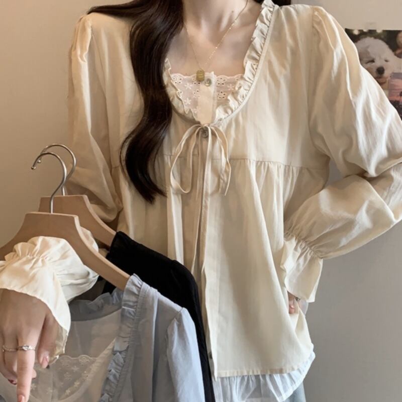 【送料無料】 レディース トップス カットソー フリル リボン 体型カバー スタイルアップ Vネック フェイクレイヤード 重ね着風 ドッキング こなれ感 シンプル カジュアル きれいめ 大人かわいい キュート 長袖 ベージュ ブルー 20代 30代 40代 通勤 通学 オフィス お出掛け 女子会 お呼ばれ 秋冬