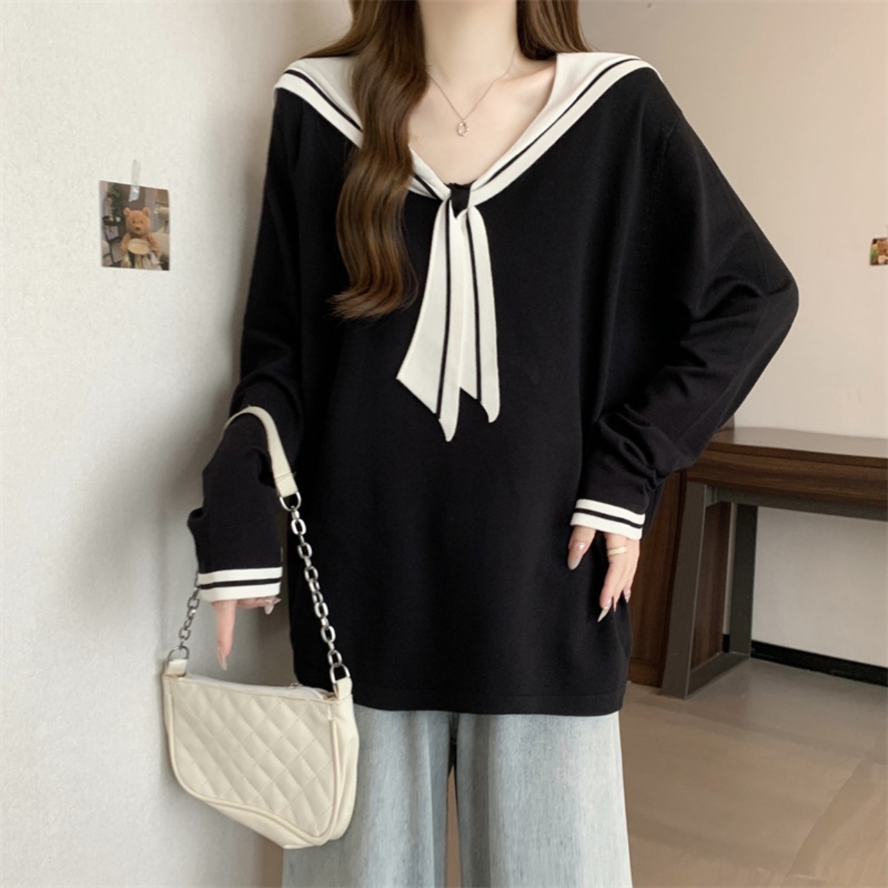 【送料無料】 レディース トップス Vネック ニット モノトーン カラーブロック 学生風 シンプル カジュアル きれいめ 大人かわいい レトロ ゆったり 体型カバー キュート セーラー 長袖 ブラック 黒 20代 30代 40代 通勤 通学 オフィス お出掛け 女子会 お呼ばれ 秋冬