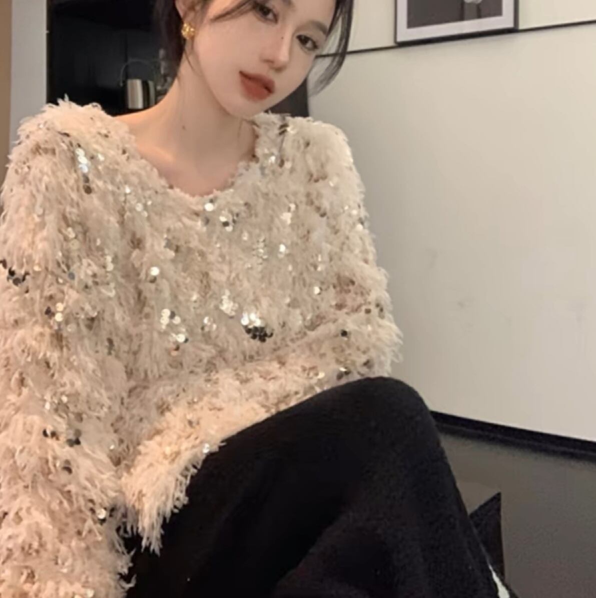 【送料無料】 レディース トップス ニット クルーネック シンプル カジュアル きれいめ 大人かわいい 華やか スパンコール こなれ感 体型カバー 長袖 アイボリー 20代 30代 40代 通勤 通学 オフィス お出掛け 女子会 お呼ばれ 秋冬