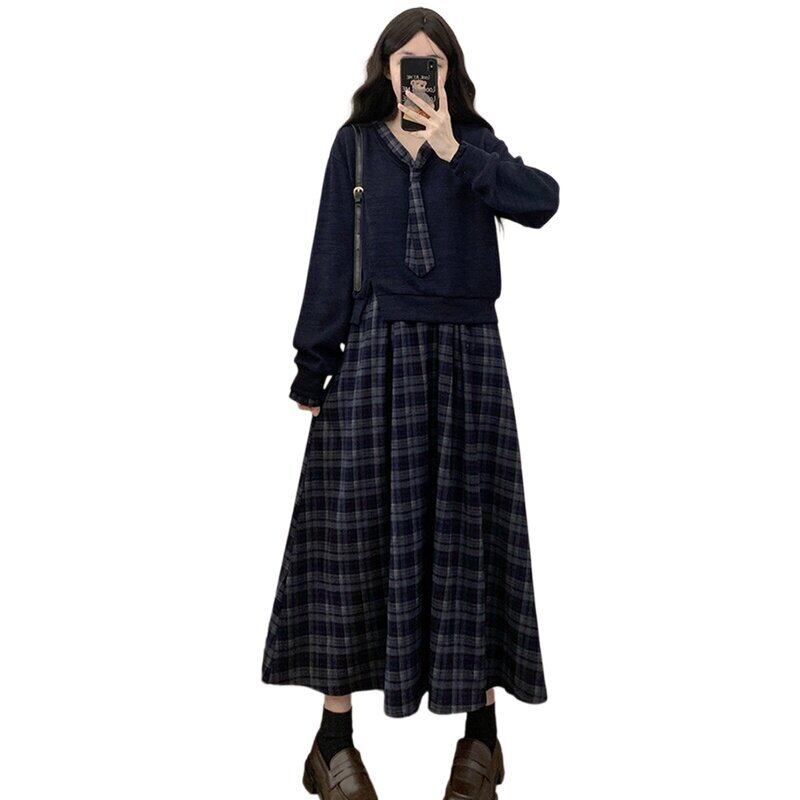【送料無料】 レディース ワンピース ドッキング 素材組み合わせ フェイクレイヤード 重ね着風 キュート チェック Aライン ロング丈 シンプル カジュアル 大人かわいい スウィート 体型カバー 長袖 20代 30代 40代 通勤 通学 オフィス お出掛け 女子会 お呼ばれ 秋冬