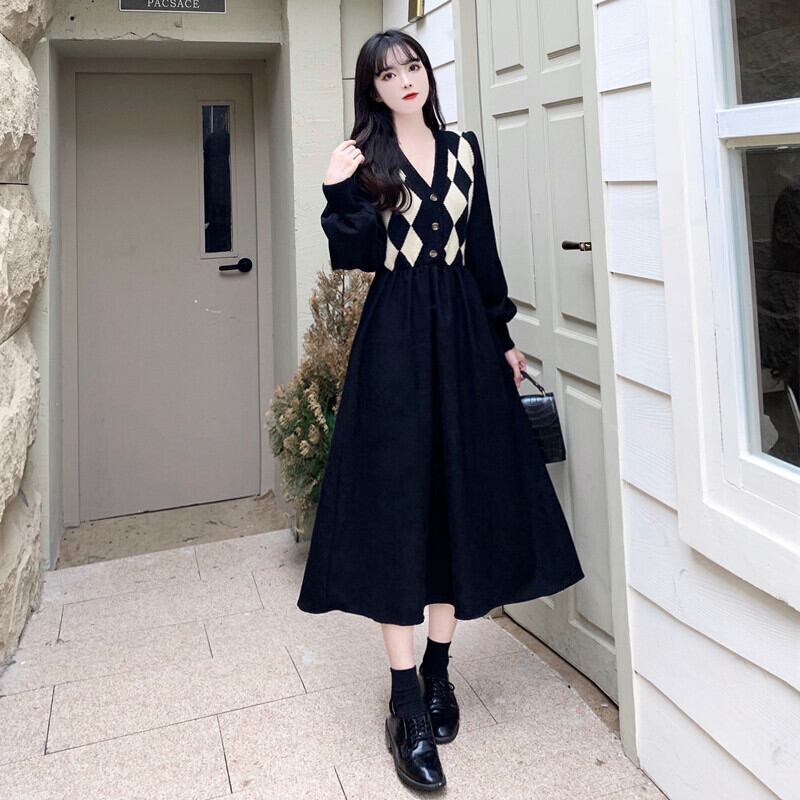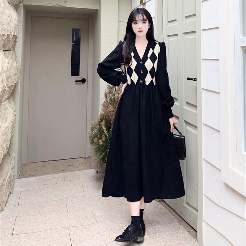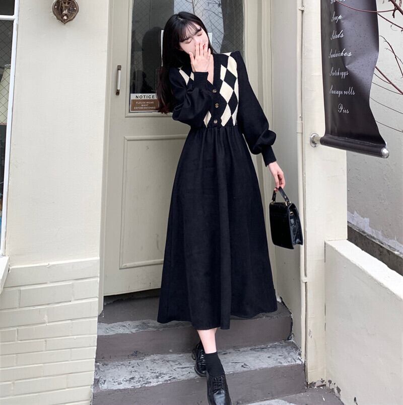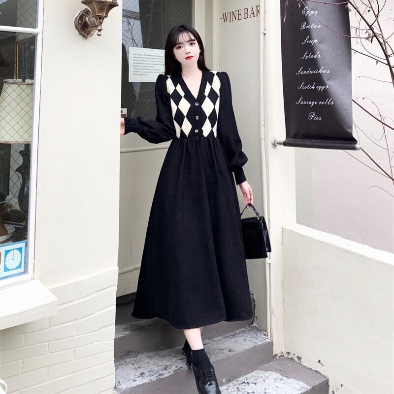 【送料無料】 レディース ワンピース ミドル丈 ミディアム丈 モノトーン Vネック 体型カバー スタイルアップ 二の腕カバー Aライン アーガイル シンプル カジュアル きれいめ 大人かわいい キュート 長袖 ブラック 20代 30代 40代 通勤 通学 オフィス お出掛け 女子会 お呼ばれ 秋冬