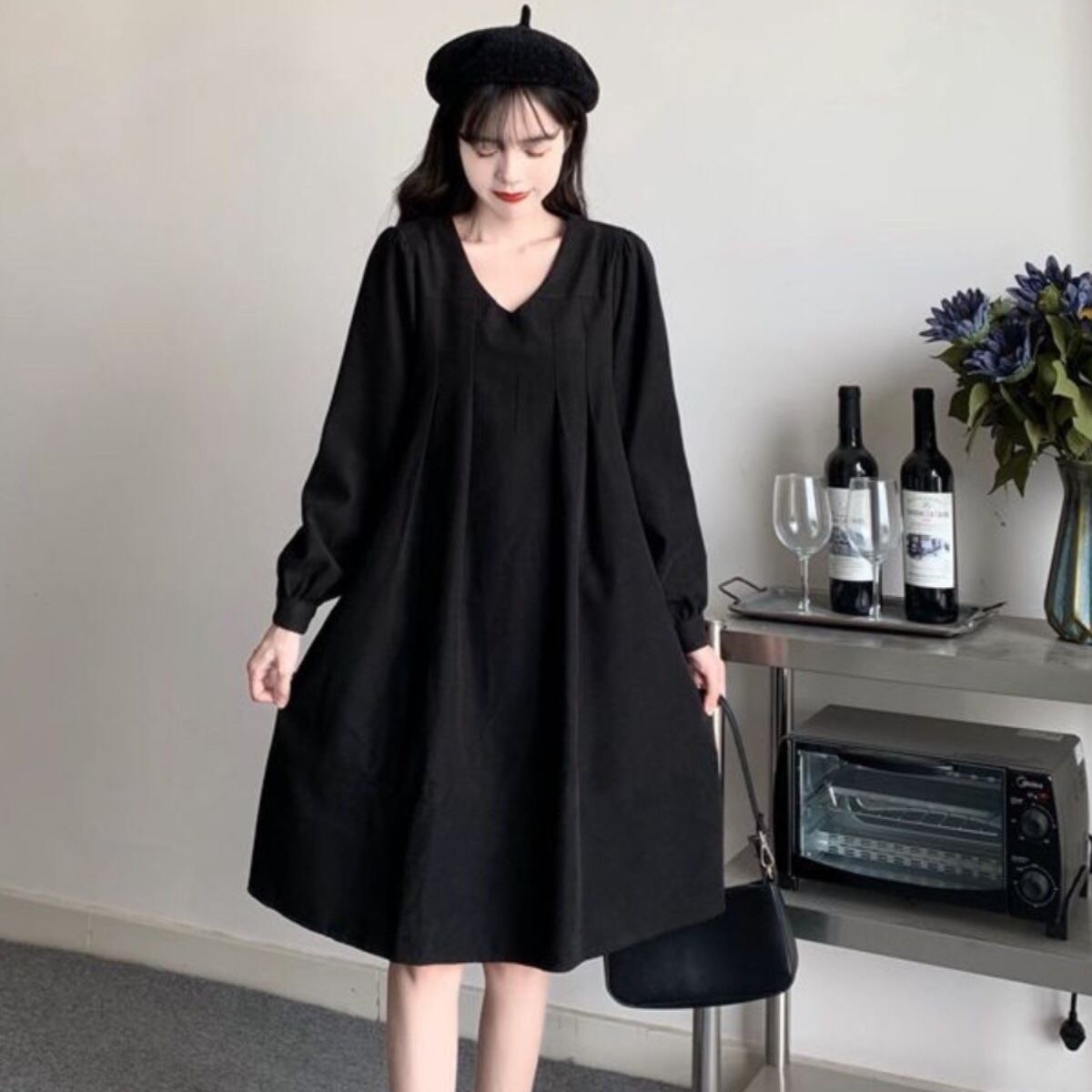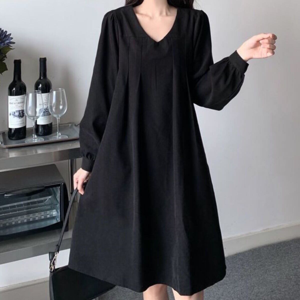 【送料無料】 レディース ワンピース Vネック Aライン ミドル丈 ミディアム丈 膝丈 ゆったり 体型カバー ふんわり袖 シンプル カジュアル こなれ感 大人かわいい 二の腕カバー ふんわり袖 長袖 ブラック 20代 30代 40代 通勤 通学 オフィス お出掛け 女子会 お呼ばれ 秋冬