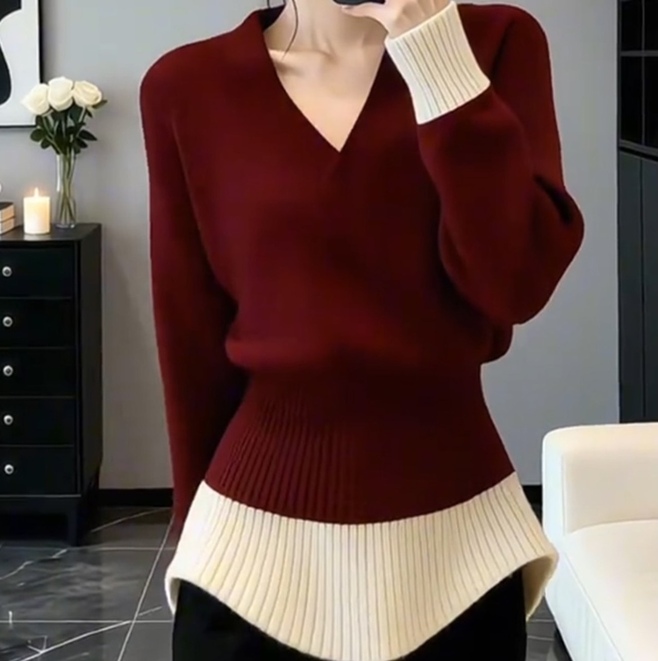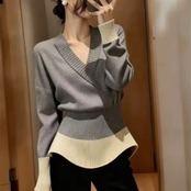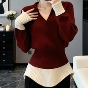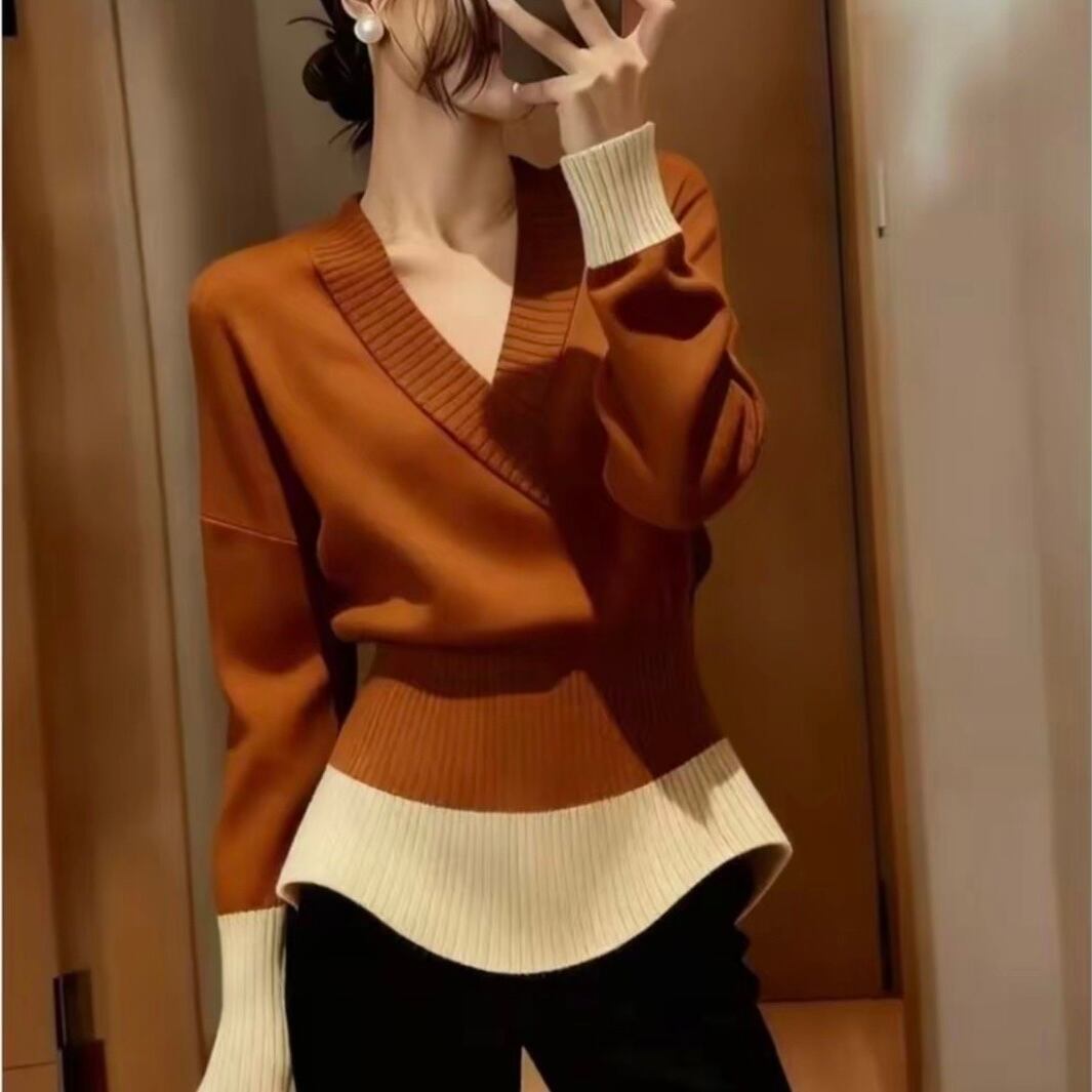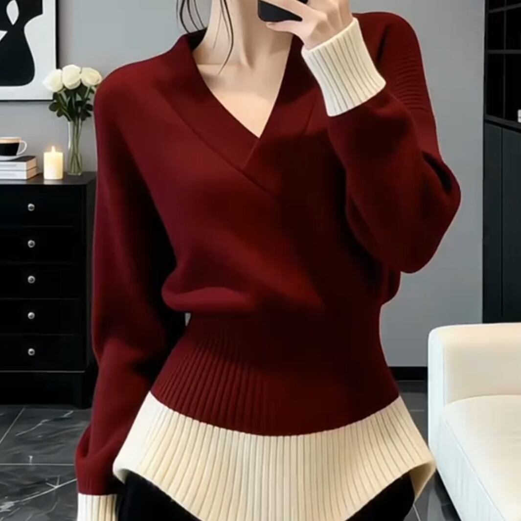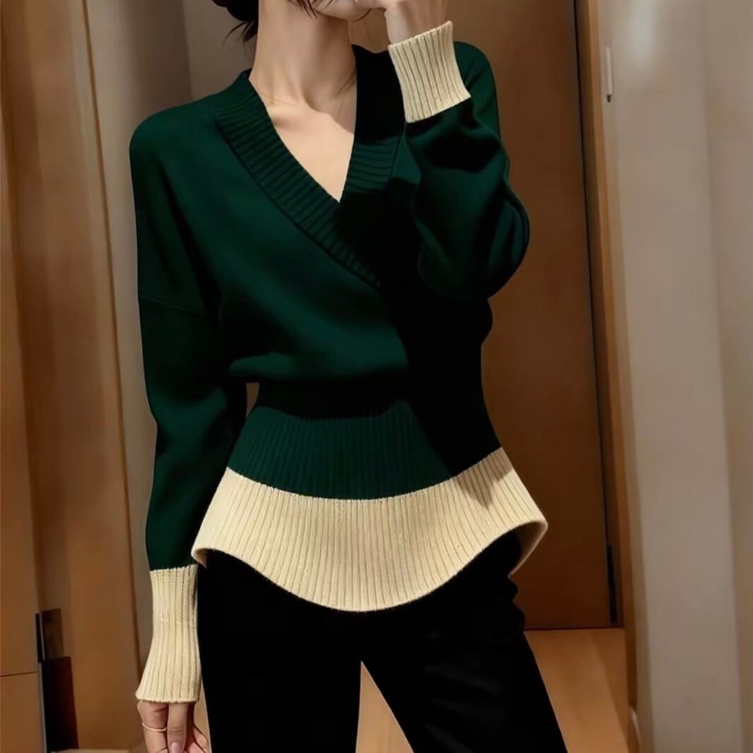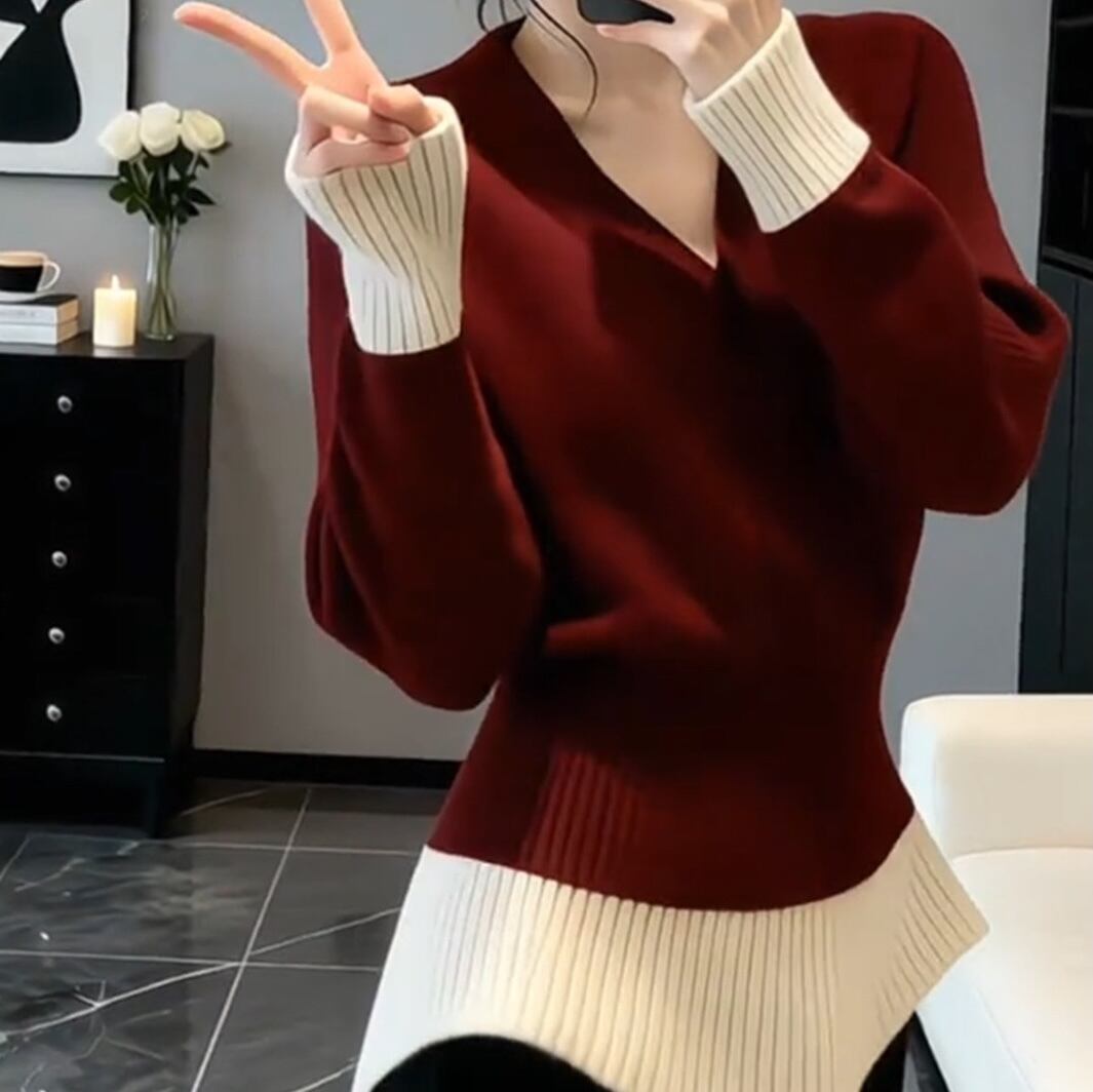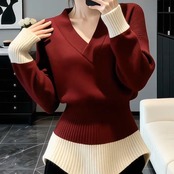 【送料無料】 レディース トップス ニット Vネック カラー切り替え カラーブロック スタイルアップ シンプル カジュアル きれいめ 大人かわいい こなれ感 体型カバー 長袖 レッド グリーン オレンジ グレー 20代 30代 40代 通勤 通学 オフィス お出掛け 女子会 お呼ばれ 秋冬