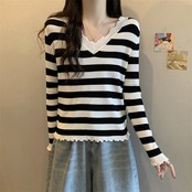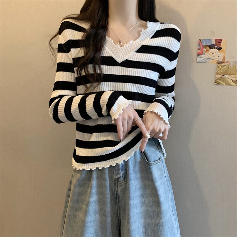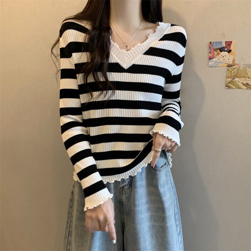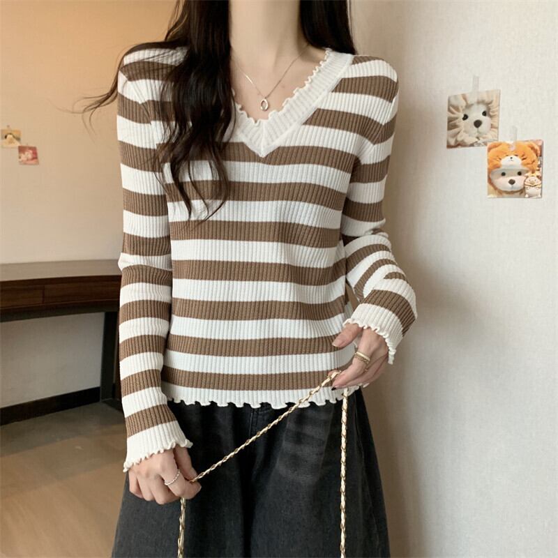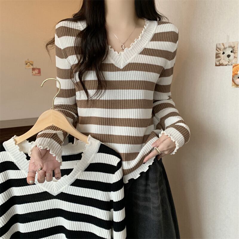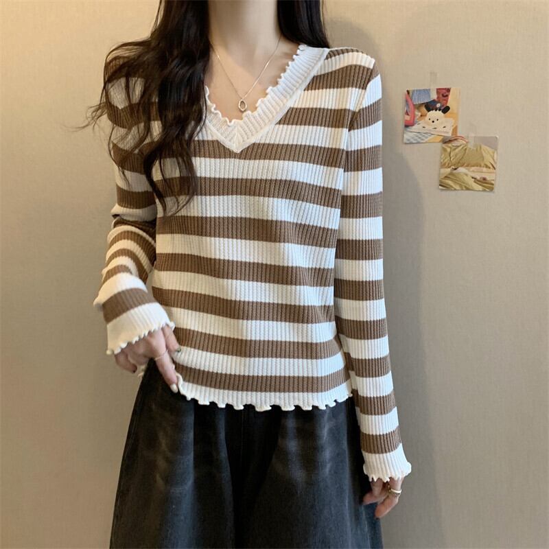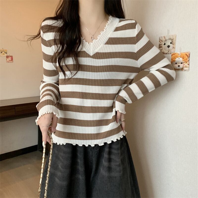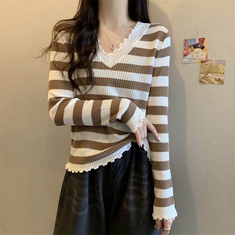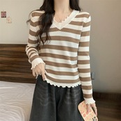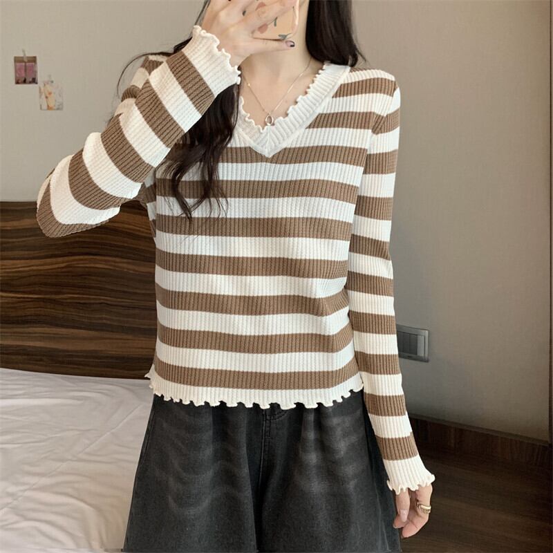 【送料無料】 レディース トップス Vネック カットソー ボーダー スタイルアップ フリル カラーブロック キュート シンプル カジュアル 体型カバー スタイルアップ こなれ感 長袖 ブラウン ブラック 20代 30代 40代 通勤 通学 オフィス お出掛け 女子会 お呼ばれ 秋冬