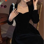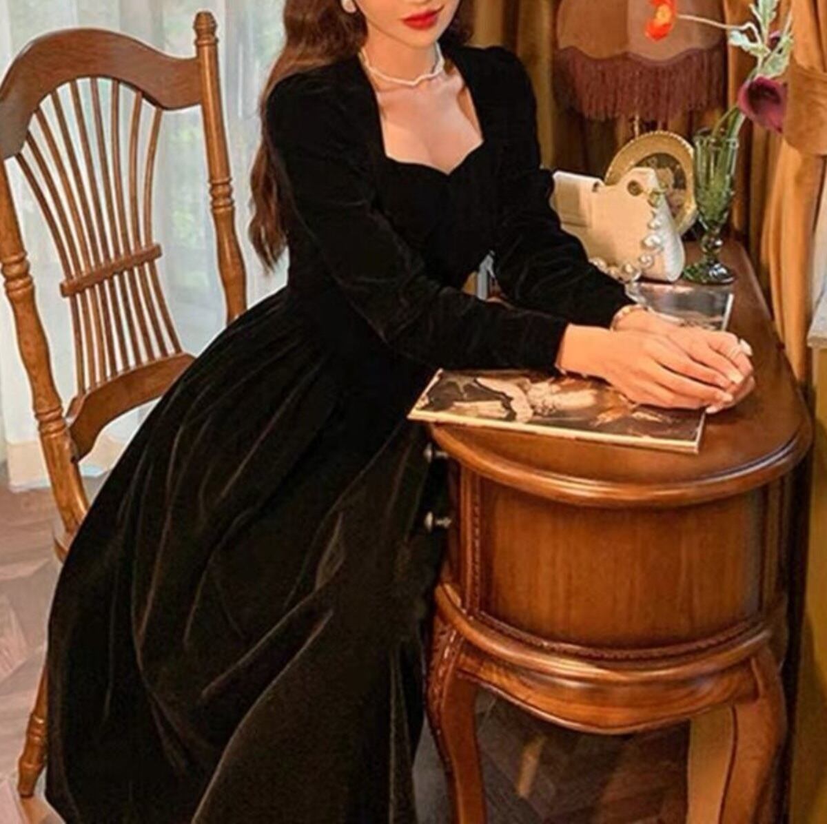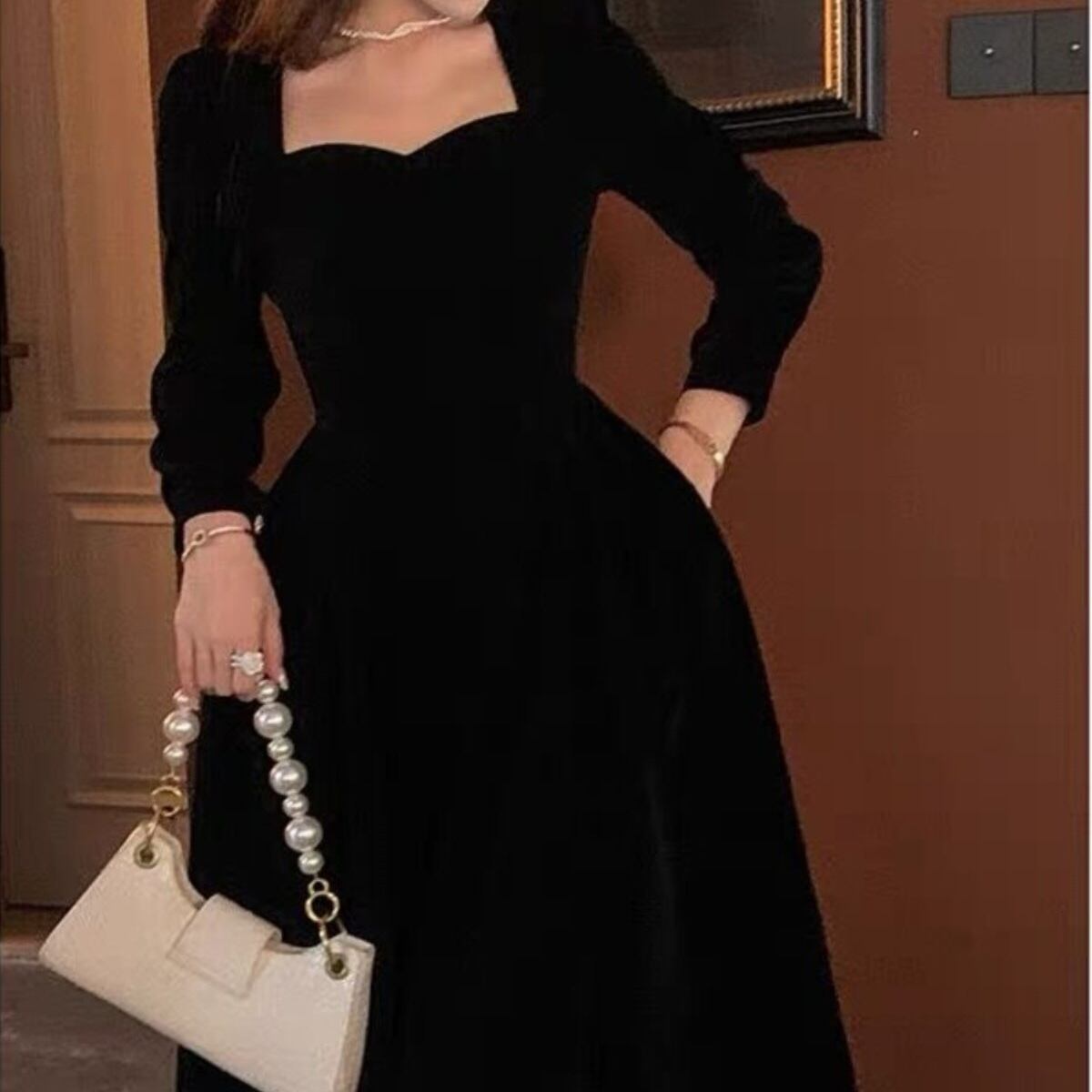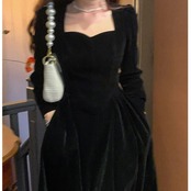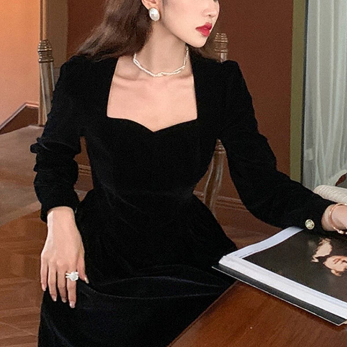 【送料無料】 レディース ドレス パーティードレス ワンピース スクエアネック ふんわり袖 Aライン ミドル丈 ミディアム丈 ミモレ丈 スタイルアップ 体型カバー こなれ感 大人かわいい シンプル きれいめ 長袖 結婚式 2次会 お呼ばれ パーティー お食事会 ディナー ランチ お出かけ 秋冬
