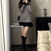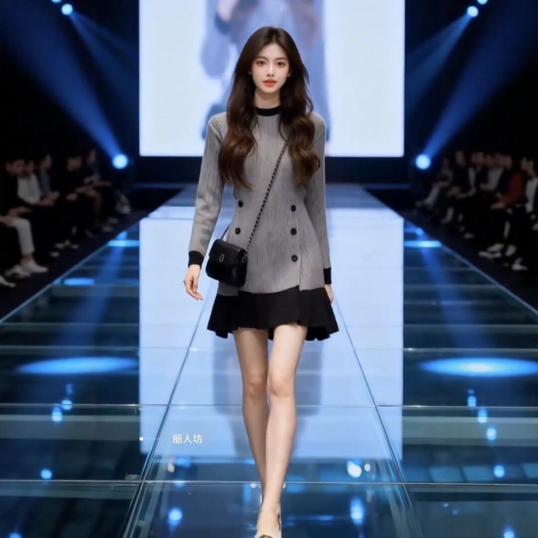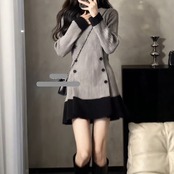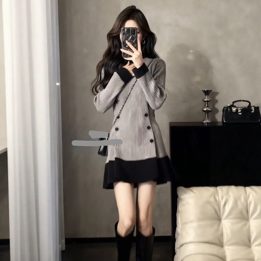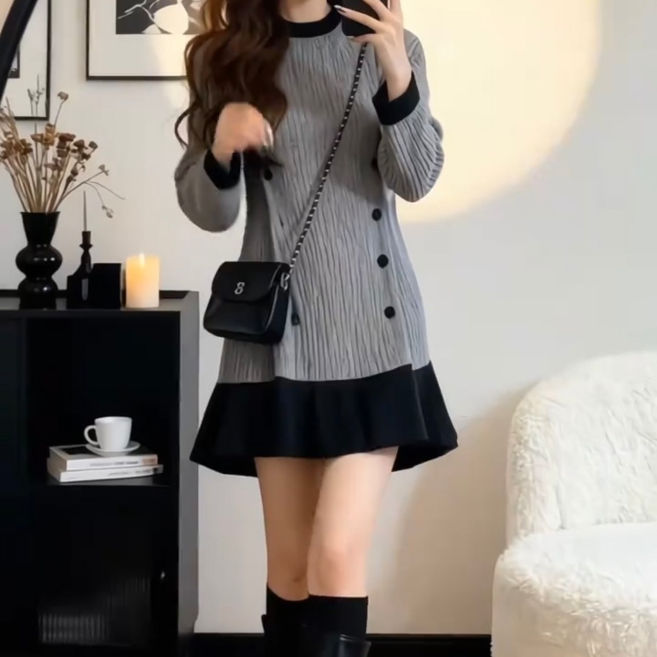 【送料無料】 レディース ワンピース ショート丈 カラー切り替え フリル ドッキング 素材組み合わせ モノトーン シンプル きれいめ 大人かわいい こなれ感 スタイルアップ 体型カバー 二の腕カバー こなれ感 長袖 グレー 20代 30代 40代 通勤 通学 オフィス お出掛け 女子会 お呼ばれ 秋冬
