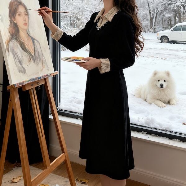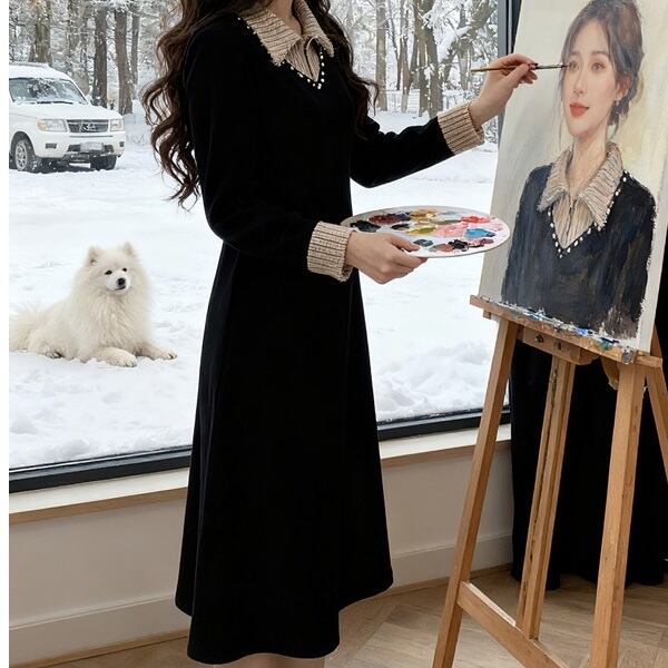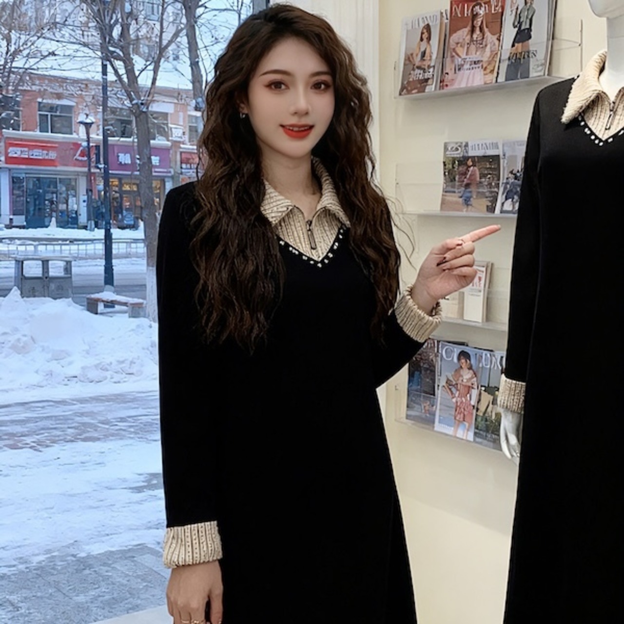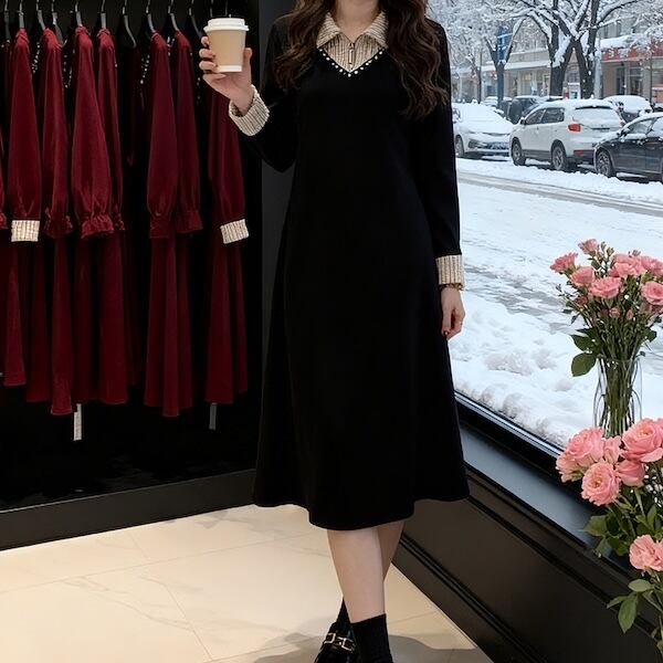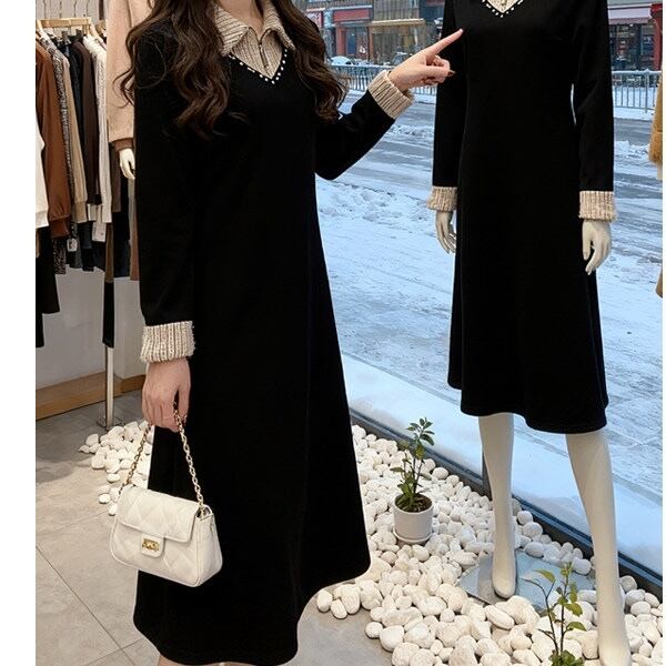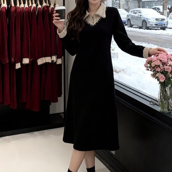 【送料無料】 レディース ワンピース Aライン カラー切り替え ドッキング 素材組み合わせ ミドル丈 ミディアム丈 体型カバー スタイルアップ シンプル きれいめ こなれ感 大人かわいい 長袖 ブラック 20代 30代 40代 通勤 通学 オフィス お出掛け 女子会 お呼ばれ 秋冬