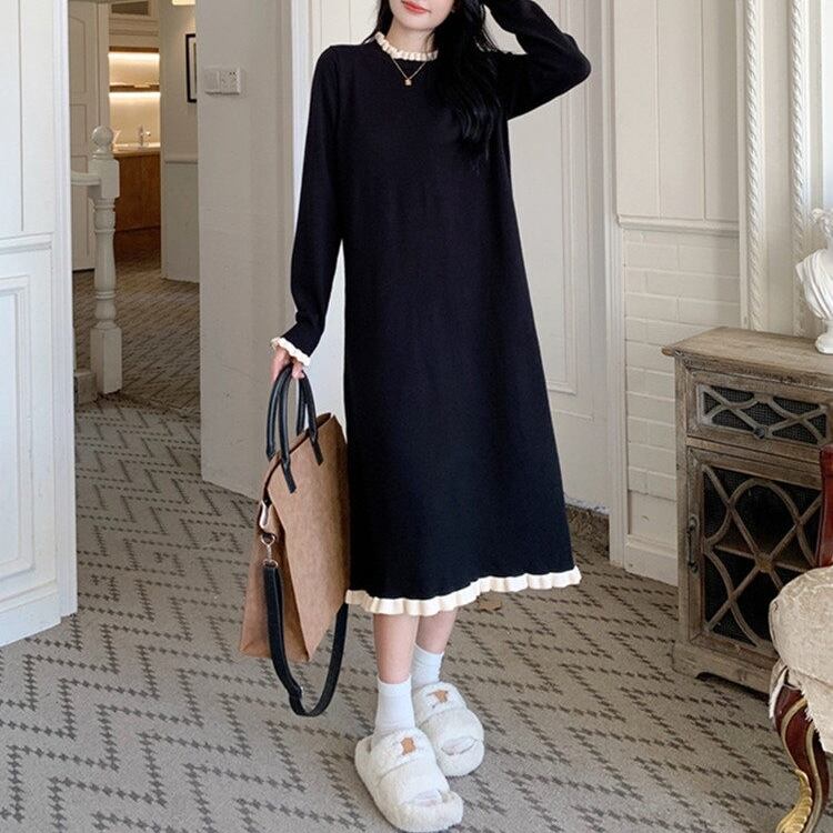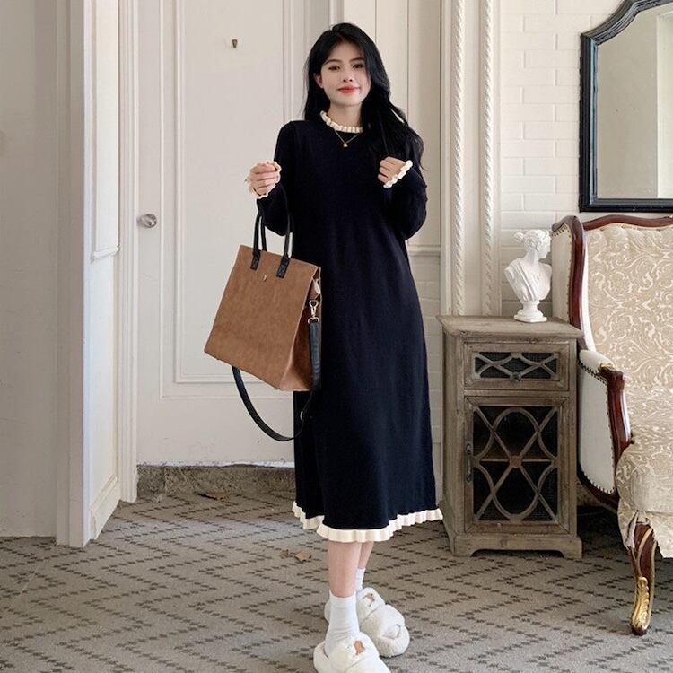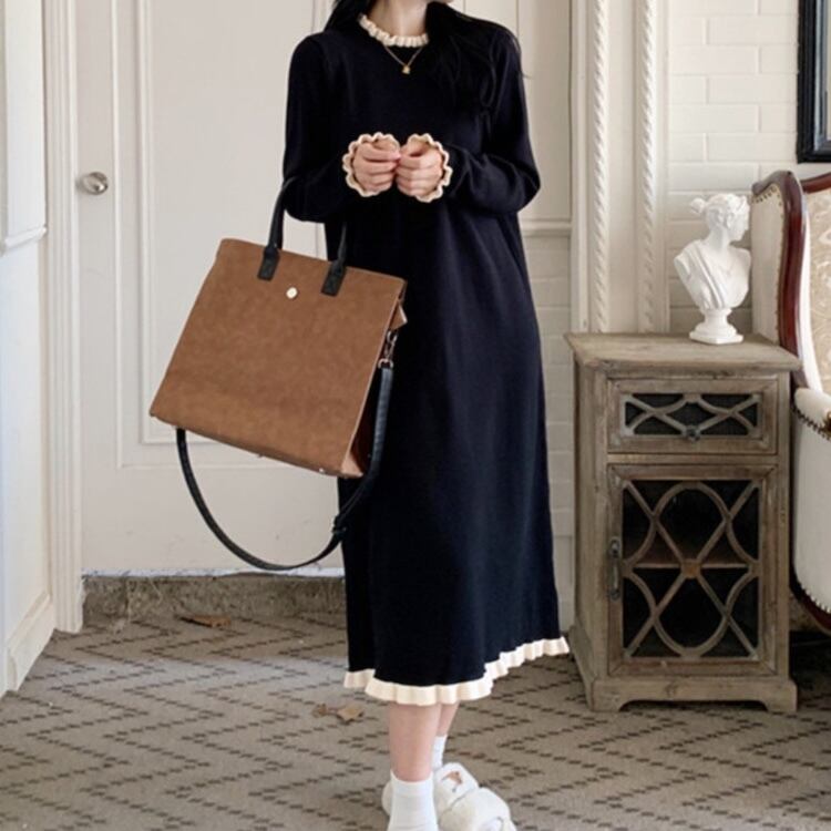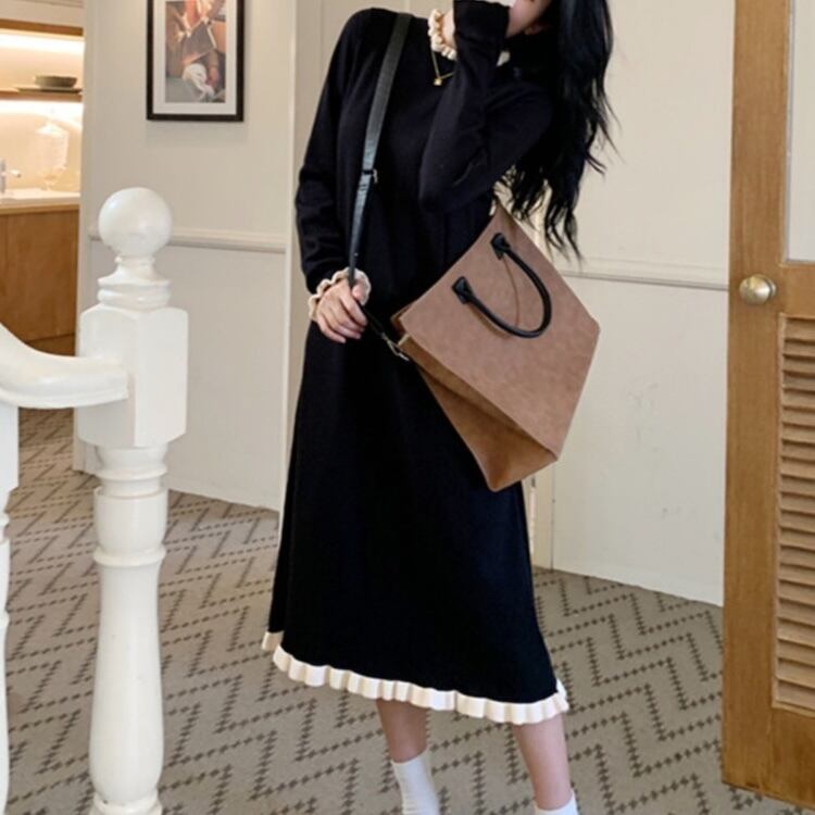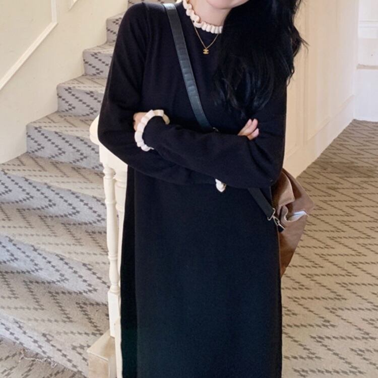 【送料無料】 レディース ワンピース モノトーン Aライン ミドル丈 ミディアム丈 体型カバー スタイルアップ 二の腕カバー モノトーン シンプル カジュアル きれいめ 大人かわいい 長袖 ブラック 20代 30代 40代 通勤 通学 オフィス お出掛け 女子会 お呼ばれ 秋冬