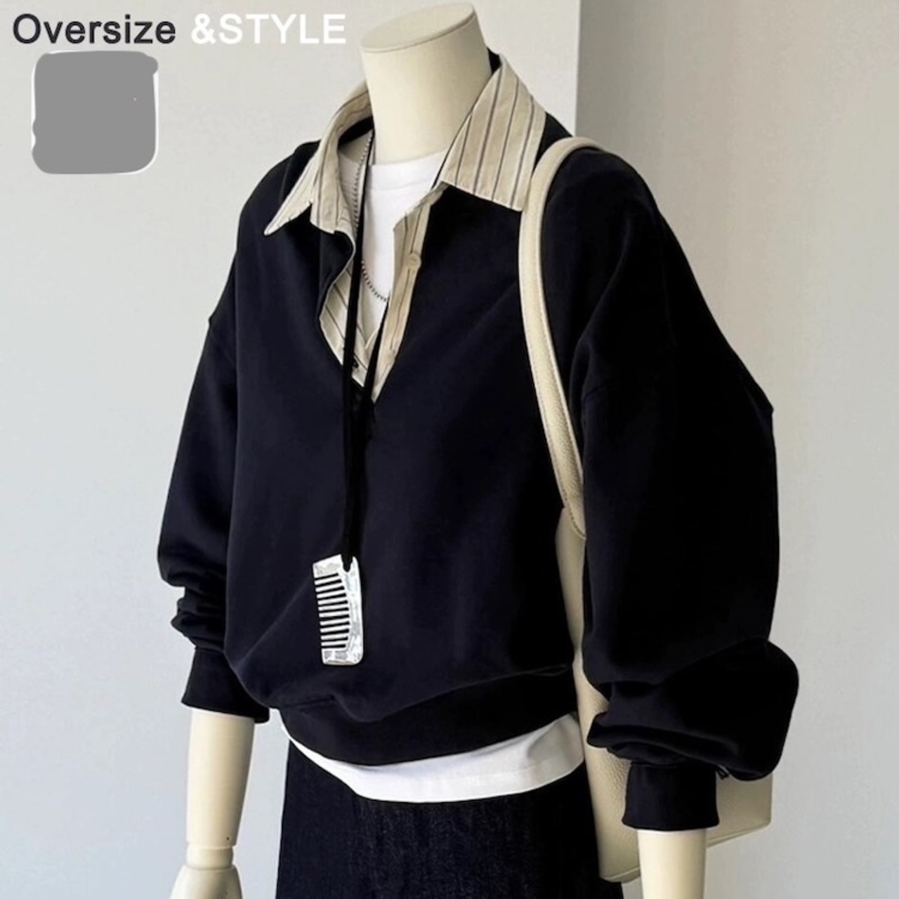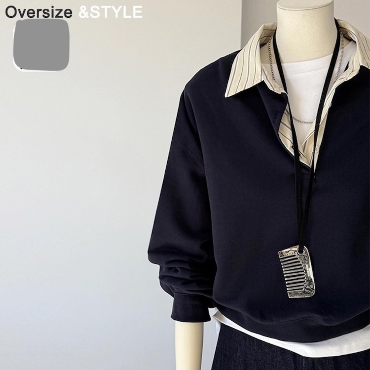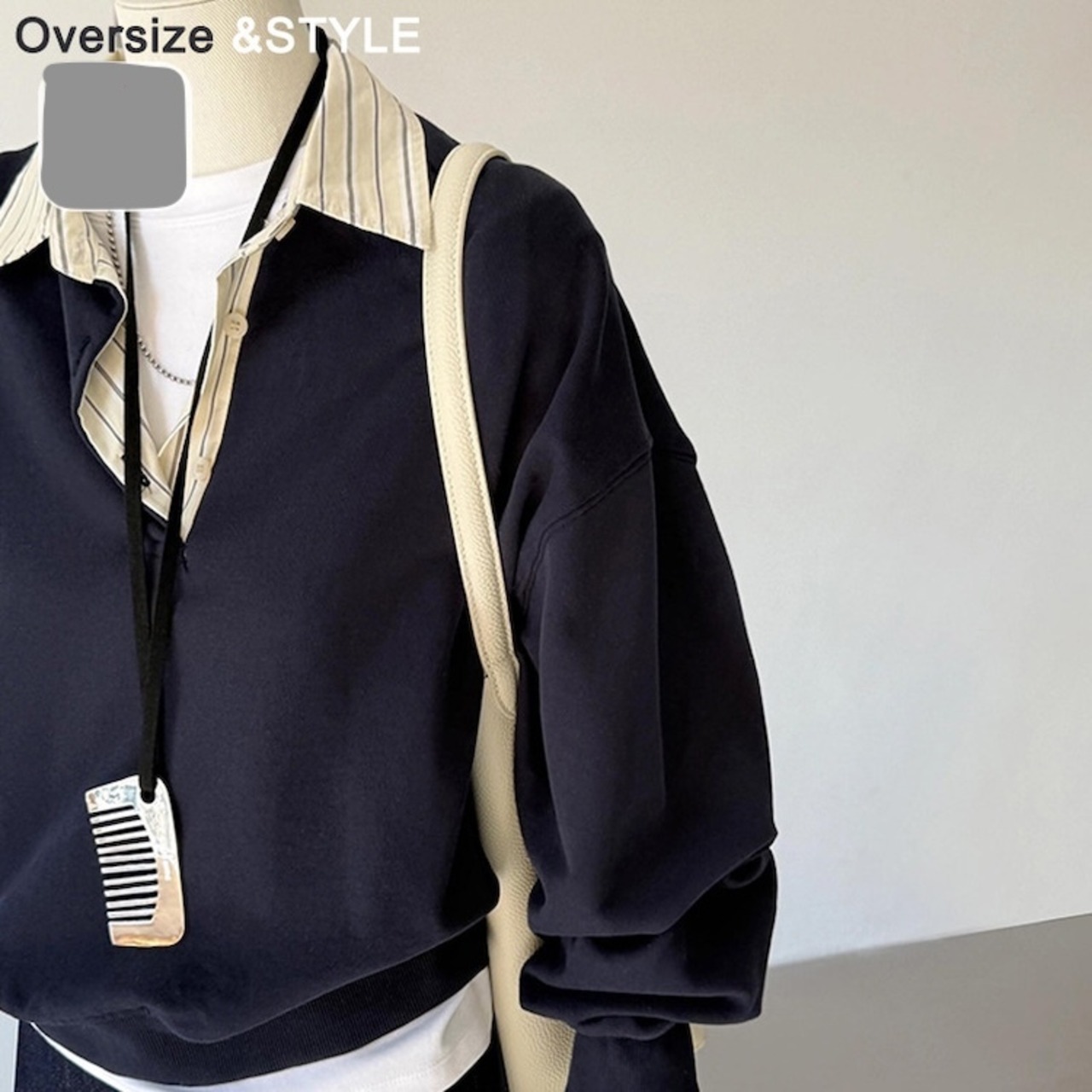 【送料無料】 レディース トップス カットソー スキッパー フェイクレイヤード 重ね着風 シャツ ストライプ カラー切り替え ドッキング 体型カバー シンプル カジュアル きれいめ こなれ感 大人かわいい 長袖 ネイビー 20代 30代 40代 通勤 通学 オフィス お出掛け 女子会 お呼ばれ 秋冬
