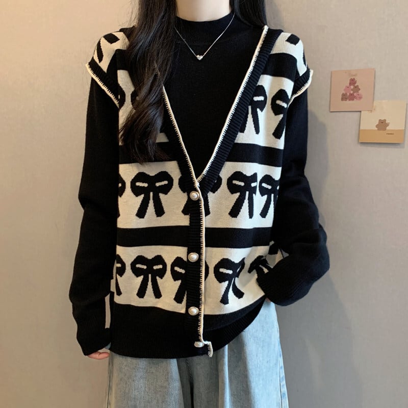 【送料無料】 レディース トップス ニット モノトーン タートルネック フェイクレイヤード 重ね着風 シンプル カジュアル きれいめ 大人かわいい リボン 体型カバー 二の腕カバー スタイルアップ こなれ感 抜け感 キュート 長袖 ブラック 20代 30代 40代 通勤 通学 オフィス お出掛け 女子会 お呼ばれ 春秋冬