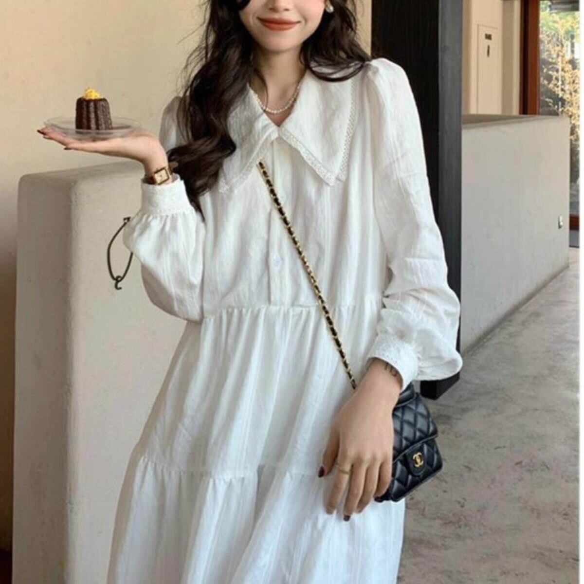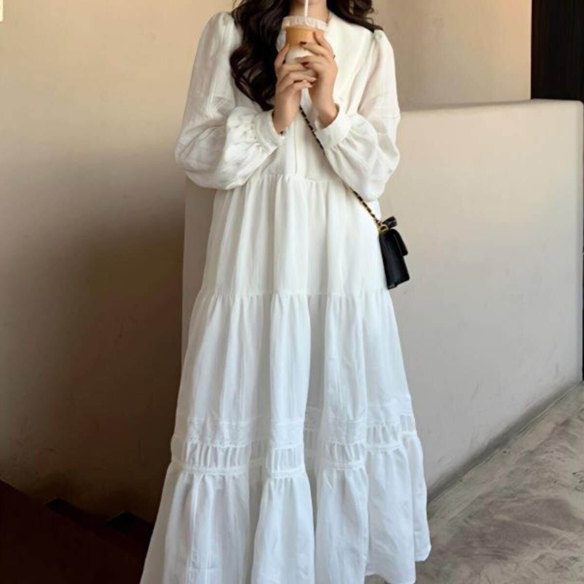 【送料無料】 レディース ワンピース Aライン クルーネック Vネック ロング丈 マキシ丈 シンプル きれいめ 大人かわいい ティアード ふんわり袖 ギャザー キュート レトロ こなれ感 体型カバー 二の腕カバー スタイルアップ 長袖 ホワイト 白 20代 30代 40代 通勤 通学 オフィス お出掛け 女子会 お呼ばれ 秋冬