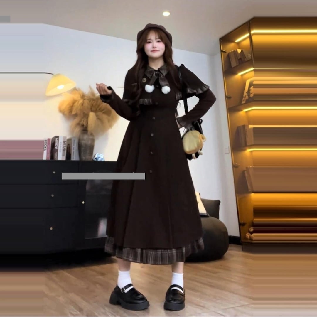 【送料無料】 レディース ワンピース Aライン クルーネック ミドル丈 ミディアム丈 ミモレ丈 ロング丈 シンプル きれいめ 大人かわいい キュート レトロ チェック カラー切り替え ドッキング こなれ感 体型カバー 二の腕カバー スタイルアップ 長袖 ブラック 黒 20代 30代 40代 通勤 通学 オフィス お出掛け 女子会 お呼ばれ 秋冬