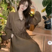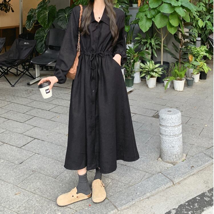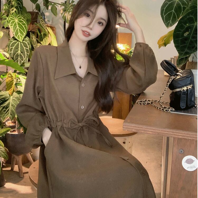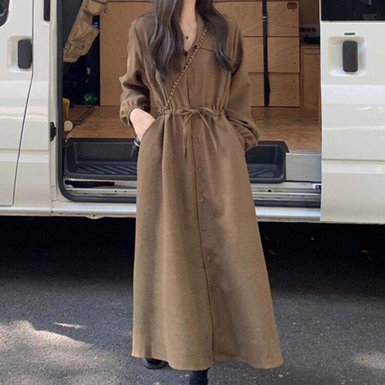 【送料無料】 レディース ワンピース Aライン Vネック ミドル丈 ミディアム丈 ミモレ丈 ロング丈 シャツワンピース シャツワンピ シンプル きれいめ 大人かわいい キュート レトロ こなれ感 体型カバー 二の腕カバー スタイルアップ 長袖 ブラウン ブラック 20代 30代 40代 通勤 通学 オフィス お出掛け 女子会 お呼ばれ 秋冬