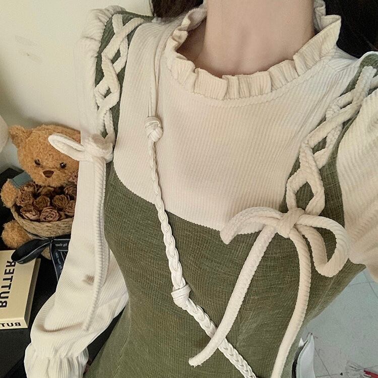【送料無料】 レディース ワンピース Aライン クルーネック ミドル丈 ミディアム丈 ミモレ丈 ロング丈 フェイクレイヤード 重ね着風 カラー切り替え カラーブロック シンプル きれいめ 大人かわいい キュート レトロ こなれ感 体型カバー 二の腕カバー スタイルアップ 長袖 20代 30代 40代 通勤 通学 オフィス お出掛け 女子会 お呼ばれ 秋冬