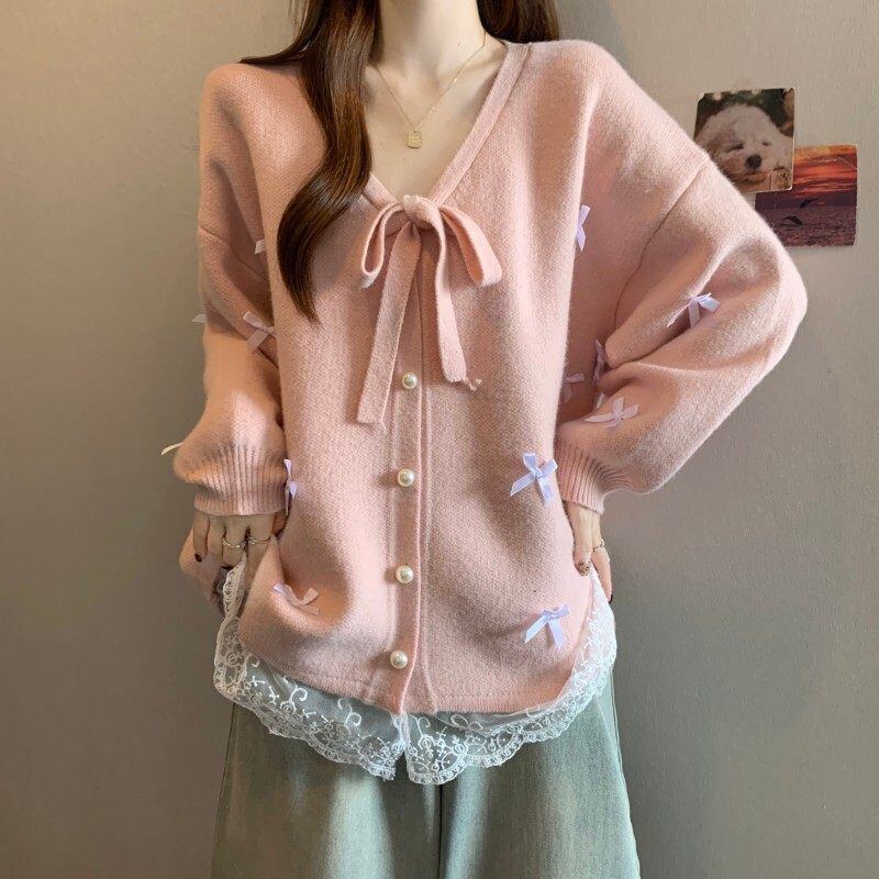 送料無料】 レディース トップス ニット カーディガン クルーネック リボン レース フェイクレイヤード 重ね着風 カラー切り替え カラーブロック 素材組み合わせ 長袖 ピンク レッド ブルー ブラック 20代 30代 40代 通勤 通学 オフィス お出掛け 女子会 お呼ばれ 秋冬