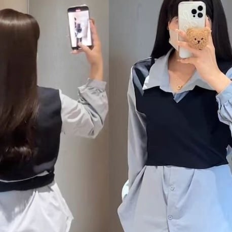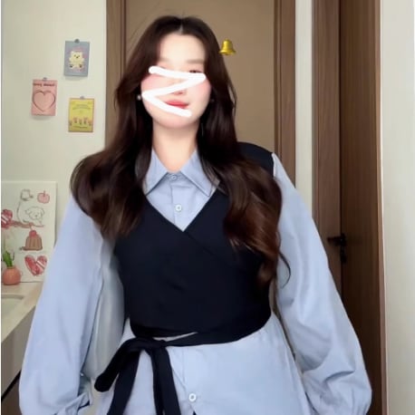 送料無料】 レディース トップス シャツ ブラウス ベスト Vネック フェイクレイヤード 重ね着風 カラー切り替え カラーブロック シンプル カジュアル きれいめ 大人かわいい リボン キュート レトロ 長袖 ブラック 20代 30代 40代 通勤 通学 オフィス お出掛け 女子会 お呼ばれ 秋冬