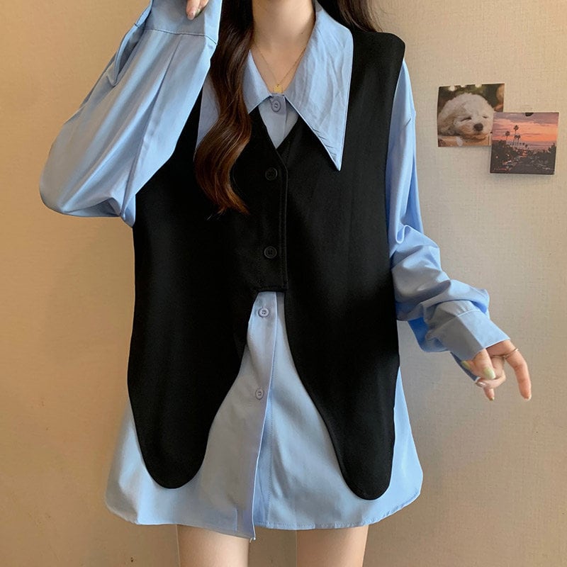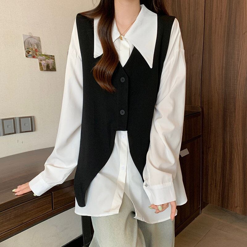 送料無料】 レディース トップス シャツ ブラウス ベスト クルーネック Vネック セットアップ カラー切り替え カラーブロック 着回し シンプル カジュアル きれいめ 大人かわいい こなれ感 体型カバー 二の腕カバー スタイルアップ 長袖 ホワイト ブルー 20代 30代 40代 通勤 通学 オフィス お出掛け 女子会 お呼ばれ 秋冬