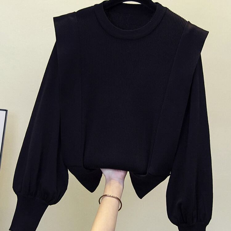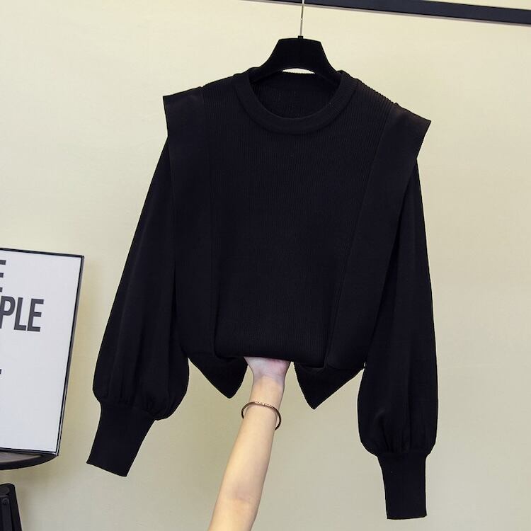 【送料無料】 レディース トップス ニット クルーネック フリル キュート シンプル カジュアル きれいめ 大人かわいい 体型カバー 二の腕カバー スタイルアップ レトロ ふんわり袖 長袖 グレー ブラック 20代 30代 40代 通勤 通学 オフィス お出掛け 女子会 お呼ばれ 秋冬