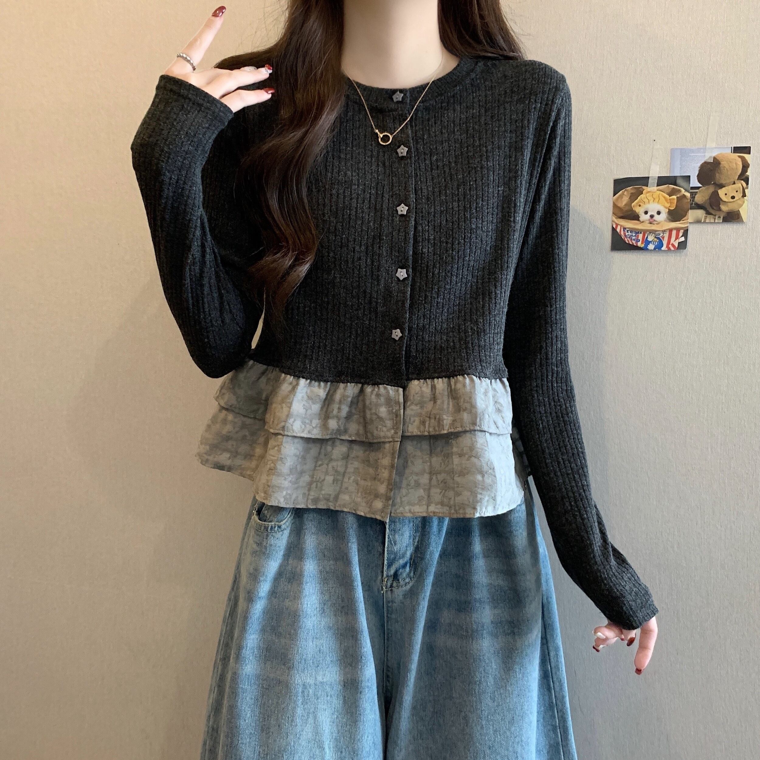 送料無料】 レディース トップス カットソー カーディガン クルーネック カラー切り替え カラーブロック ドッキング 素材組み合わせ シンプル カジュアル きれいめ 大人かわいい フリル キュート 体型カバー 二の腕カバー スタイルアップ 長袖 ブラック 20代 30代 40代 通勤 通学 オフィス お出掛け 女子会 お呼ばれ 秋冬
