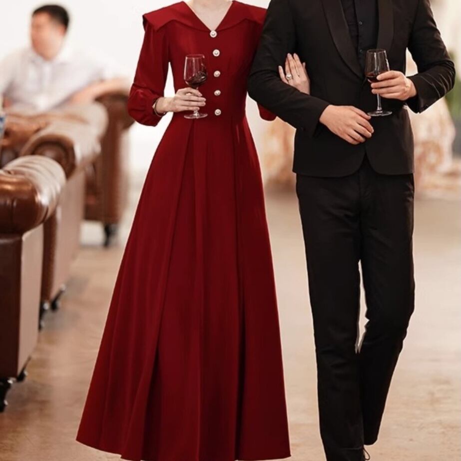【送料無料】 レディース ドレス パーティードレス ワンピース Aライン Vネック ロング丈 マキシ丈 シンプル きれいめ 大人かわいい キュート レトロ こなれ感 体型カバー 二の腕カバー スタイルアップ 長袖 レッド ワインレッド 結婚式 2次会 お呼ばれ パーティー お食事会 ディナー ランチ お出かけ 秋冬