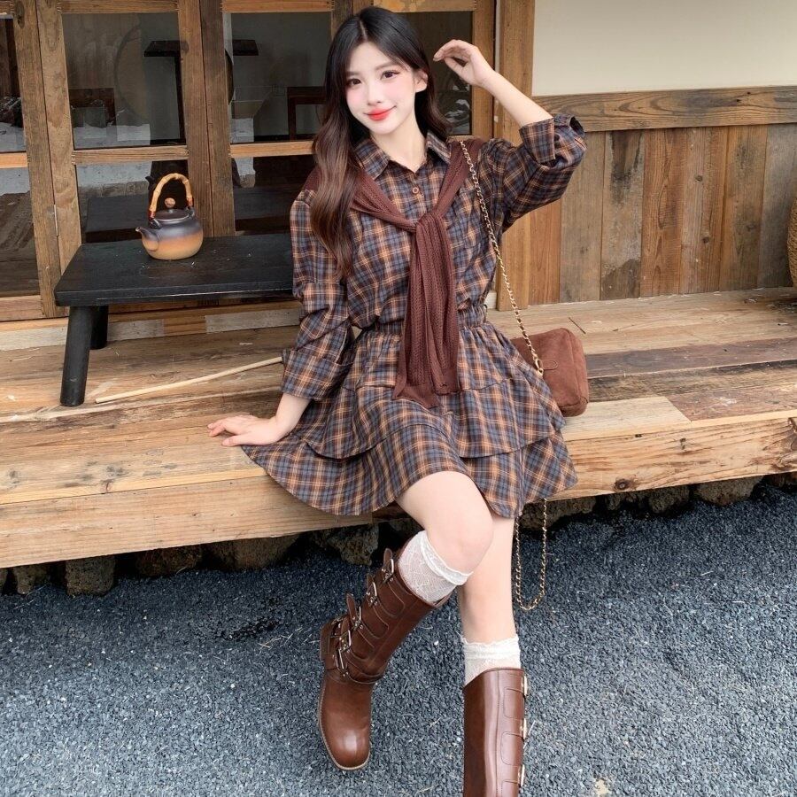 【送料無料】 レディース ワンピース Aライン クルーネック ミニ丈 ショート丈 シンプル きれいめ 大人かわいい キュート レトロ こなれ感 体型カバー 二の腕カバー スタイルアップ ウエストマーク チェック フリル ティーアード 長袖 ブラウン 20代 30代 40代 通勤 通学 オフィス お出掛け 女子会 お呼ばれ 秋冬
