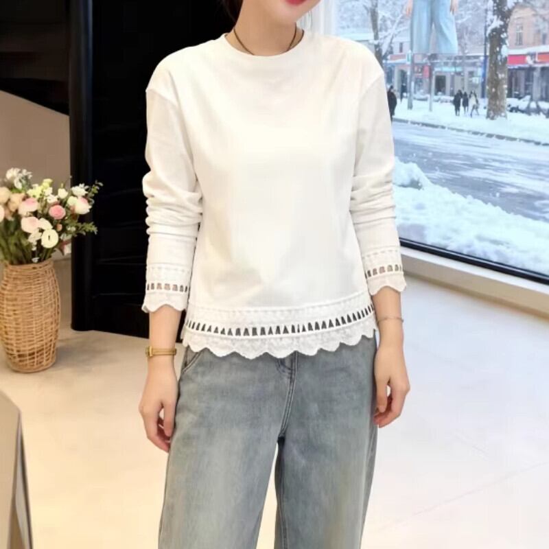 【送料無料】 レディース トップス カットソー クルーネック シンプル カジュアル きれいめ 大人かわいい 体型カバー 二の腕カバー スタイルアップ ドッキング 素材組み合わせ レース 長袖 ホワイト 白 20代 30代 40代 通勤 通学 オフィス お出掛け 女子会 お呼ばれ 春夏