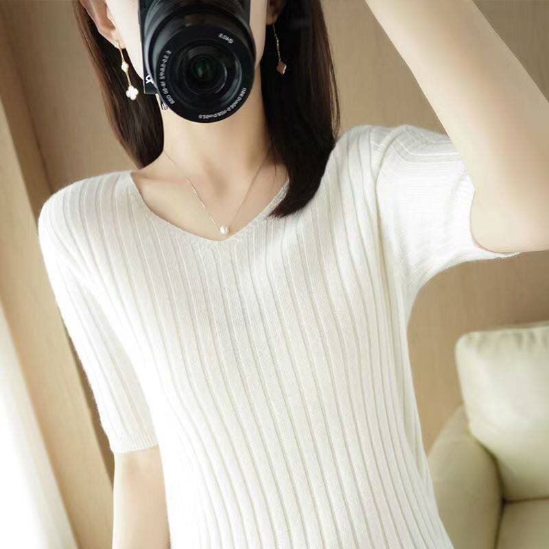 【送料無料】 レディース トップス ニット Vネック シンプル カジュアル きれいめ 大人かわいい リブ スッキリ 体型カバー 二の腕カバー スタイルアップ こなれ感 半袖 ホワイト ブラウン ブラック 20代 30代 40代 通勤 通学 オフィス お出掛け 女子会 お呼ばれ 春夏