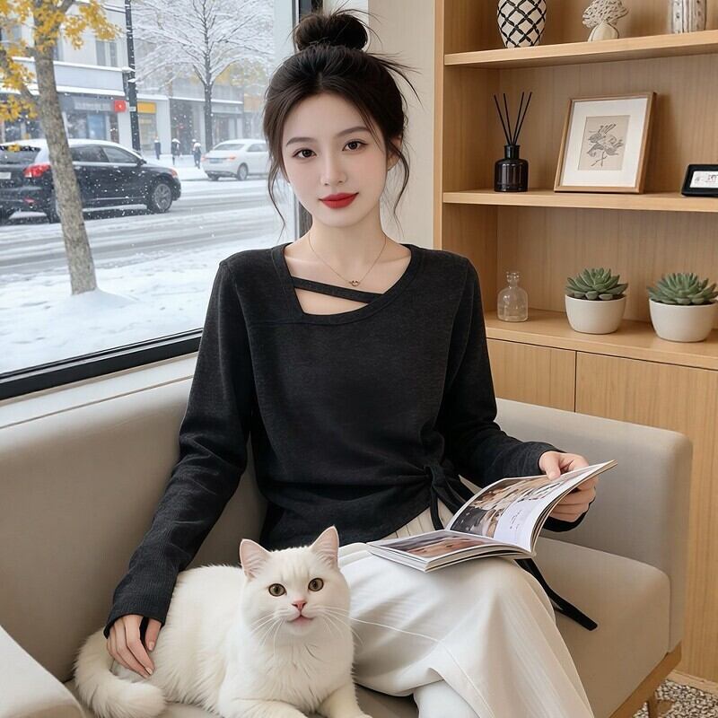 【送料無料】 レディース トップス カットソー クルーネック Vネック アシンメトリー ウエストシェイプ シンプル カジュアル きれいめ 大人かわいい 体型カバー 二の腕カバー スタイルアップ リボン 長袖 アイボリー ブラック 20代 30代 40代 通勤 通学 オフィス お出掛け 女子会 お呼ばれ 春夏