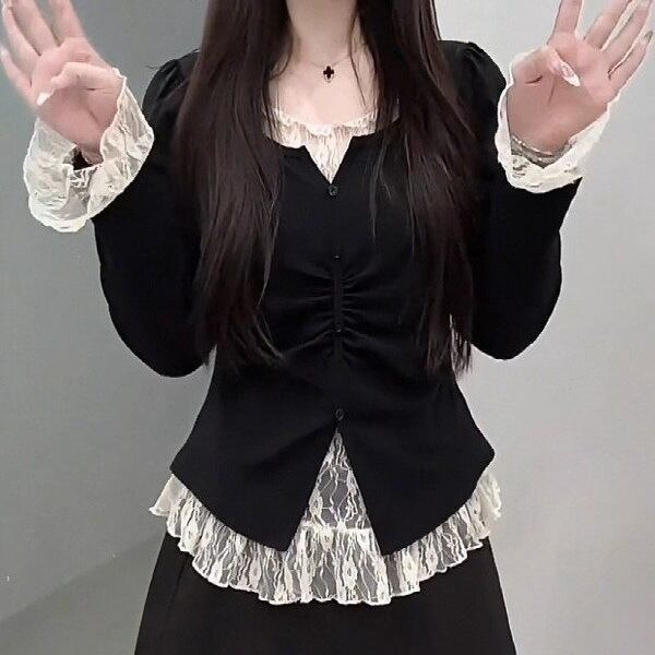 【送料無料】 レディース トップス カットソー クルーネック スクエアネック ドッキング 素材組み合わせ レース キュート レトロ フェイクレイヤード 重ね着風 シンプル カジュアル きれいめ 大人かわいい 体型カバー 二の腕カバー スタイルアップ 長袖 グレー アイボリー ブラック 20代 30代 40代 通勤 通学 オフィス お出掛け 女子会 お呼ばれ 春夏