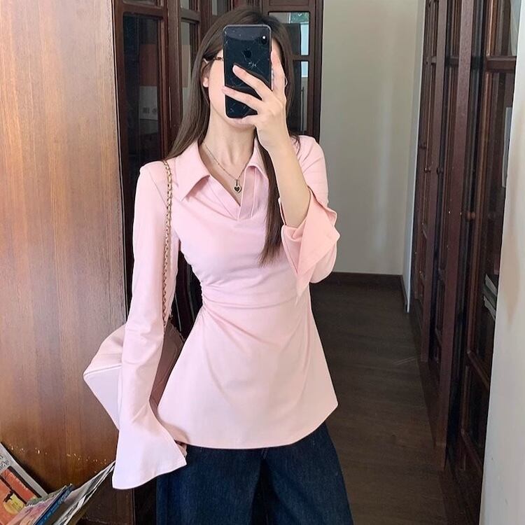 【送料無料】 レディース トップス カットソー Vネック ポロスタイル シンプル カジュアル きれいめ 大人かわいい 体型カバー 二の腕カバー スタイルアップ ウエストシェイプ ロング丈 ベルスリーブ こなれ感 長袖 グレー ピンク ブラック 20代 30代 40代 通勤 通学 オフィス お出掛け 女子会 お呼ばれ 春夏