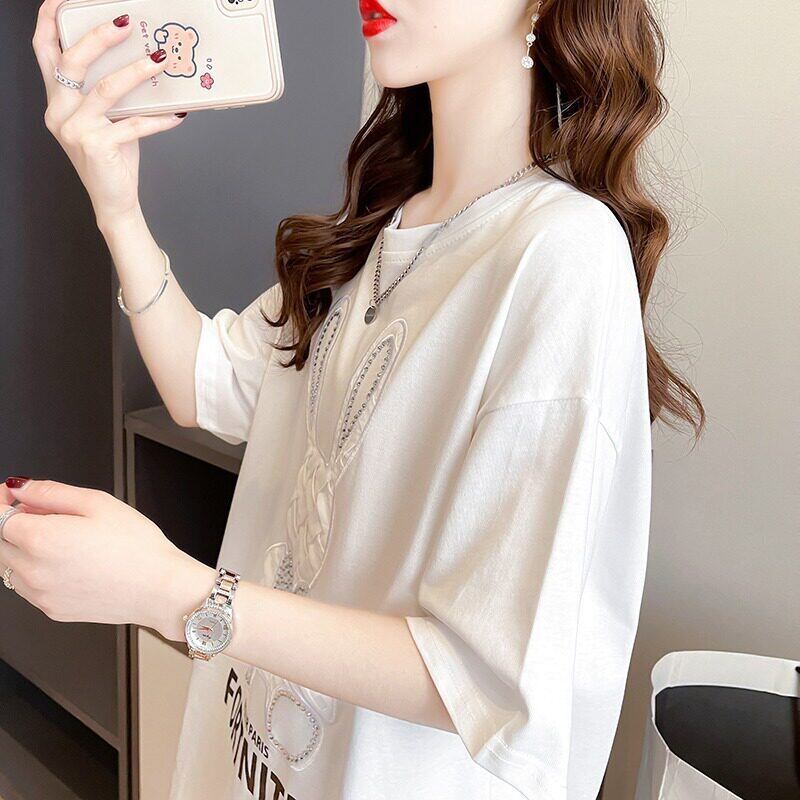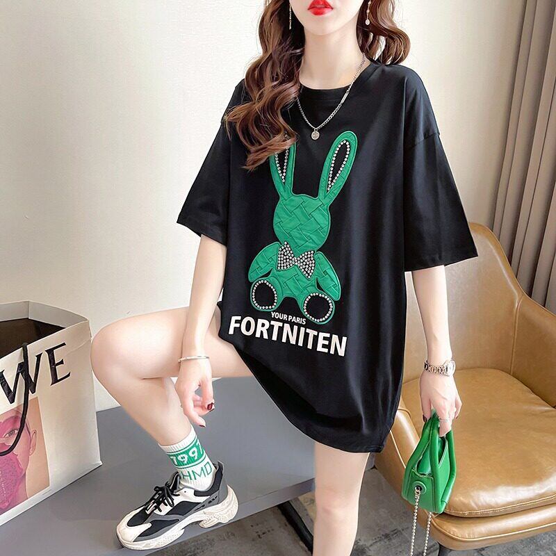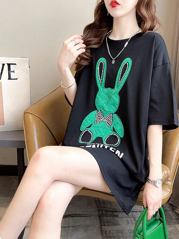 【送料無料】 レディース カットソー クルーネック ロング丈 バニー アニマル モチーフ ゆったり リラックス シンプル カジュアル きれいめ 大人かわいい 体型カバー 二の腕カバー スタイルアップ 半袖 ホワイト ブラック 20代 30代 40代 通勤 通学 オフィス お出掛け 女子会 お呼ばれ 春夏