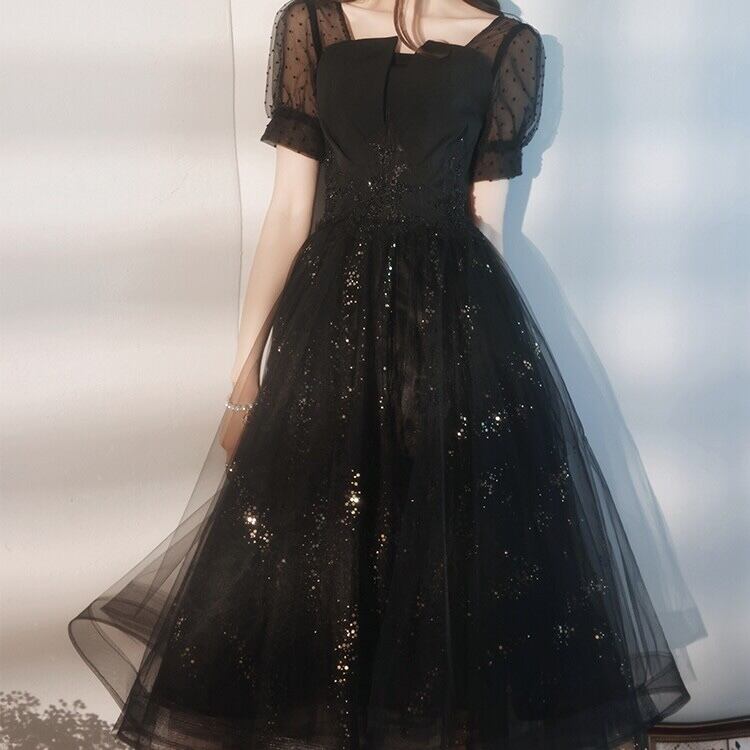 【送料無料】 レディース ドレス パーティードレス ワンピース Aライン スクエアネック ミドル丈 ミディアム丈 ミモレ丈 シンプル きれいめ 大人かわいい キュート レトロ こなれ感 体型カバー 二の腕カバー スタイルアップ ふんわり袖 レース フリル 半袖 ブラック 黒 結婚式 2次会 お呼ばれ パーティー お食事会 ディナー ランチ お出かけ 春夏
