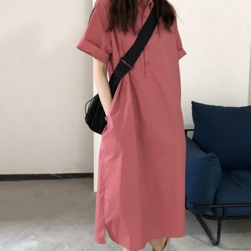 【送料無料】 レディース ワンピース Aライン クルーネック ミドル丈 ミディアム丈 ミモレ丈 ロング丈 ゆったり リラックス シンプル きれいめ 大人かわいい キュート レトロ こなれ感 体型カバー 二の腕カバー スタイルアップ 半袖 ピンク 20代 30代 40代 通勤 通学 オフィス お出掛け 女子会 お呼ばれ 春夏