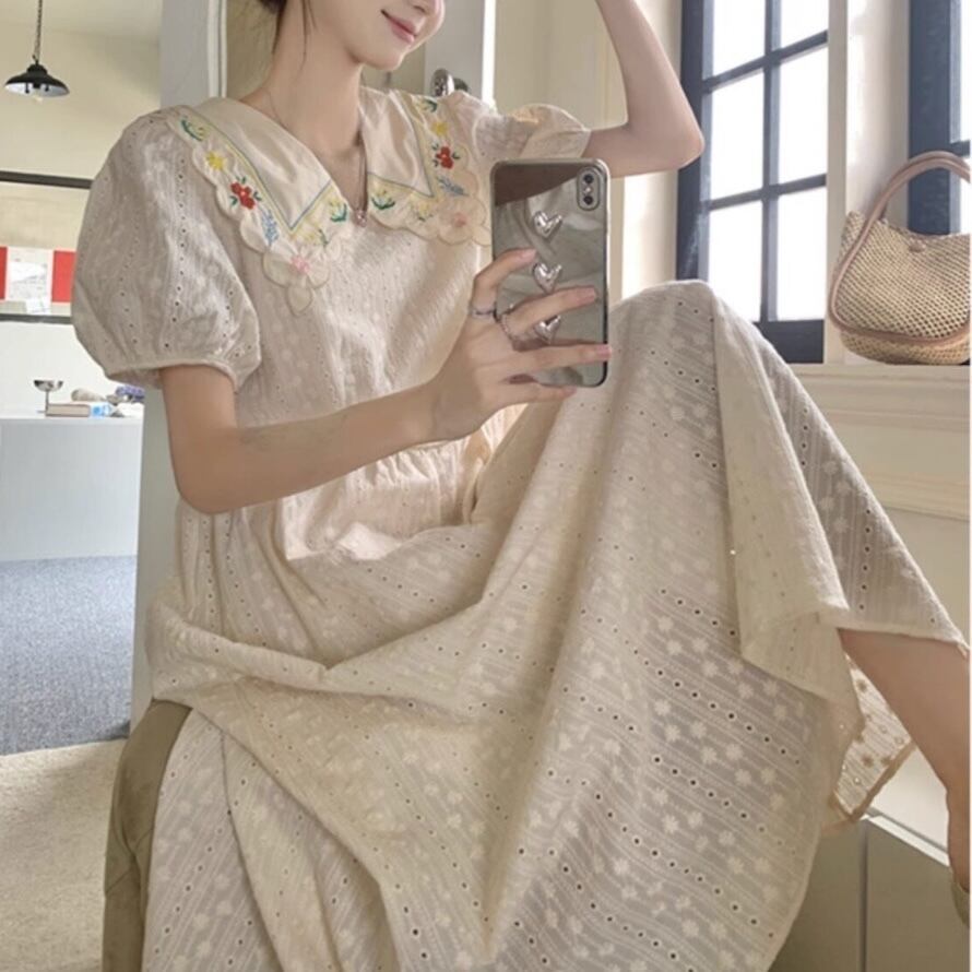 【送料無料】 レディース ワンピース Aライン クルーネック ふんわり袖 ミドル丈 ミディアム丈 ミモレ丈 シンプル きれいめ 大人かわいい キュート レトロ こなれ感 体型カバー 二の腕カバー スタイルアップ 半袖 アイボリー 20代 30代 40代 通勤 通学 オフィス お出掛け 女子会 お呼ばれ 春夏