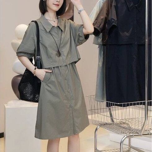【送料無料】 レディース ワンピース クルーネック ショート丈 ミドル丈 ミディアム丈 シンプル きれいめ 大人かわいい キュート レトロ こなれ感 体型カバー 二の腕カバー スタイルアップ 半袖 カーキ ブラウン ブルー ネイビー 20代 30代 40代 通勤 通学 オフィス お出掛け 女子会 お呼ばれ 春夏