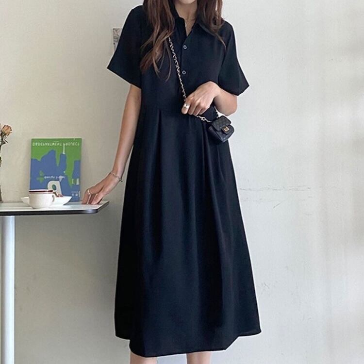 【送料無料】 レディース ワンピース Aライン クルーネック ポロスタイル シャツワンピース ミドル丈 ミディアム丈 ミモレ丈 シンプル きれいめ 大人かわいい キュート レトロ こなれ感 体型カバー 二の腕カバー スタイルアップ 半袖 ブラック 20代 30代 40代 通勤 通学 オフィス お出掛け 女子会 お呼ばれ 春夏