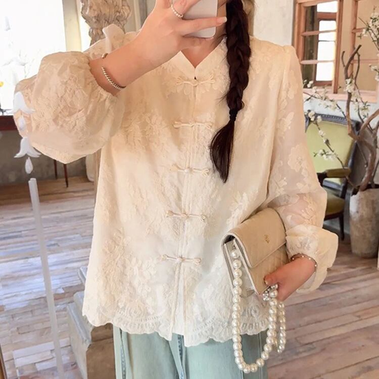 【送料無料】 レディース トップス シャツ ブラウス クルーネック ナチュラル シアー 透け感 シンプル カジュアル きれいめ 大人かわいい キュート レトロ 体型カバー 二の腕カバー スタイルアップ ふんわり袖 スタンドカラー チャイナ レース こなれ感 長袖 アイボリー 20代 30代 40代 通勤 通学 オフィス お出掛け 女子会 お呼ばれ 春夏