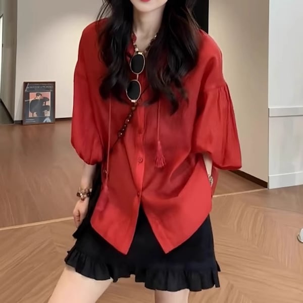 【送料無料】 レディース トップス ブラウス クルーネック ノーカラー ふんわり袖 ゆったり シンプル カジュアル きれいめ 大人かわいい 体型カバー 二の腕カバー スタイルアップ こなれ感 長袖 レッド 20代 30代 40代 通勤 通学 オフィス お出掛け 女子会 お呼ばれ 春夏