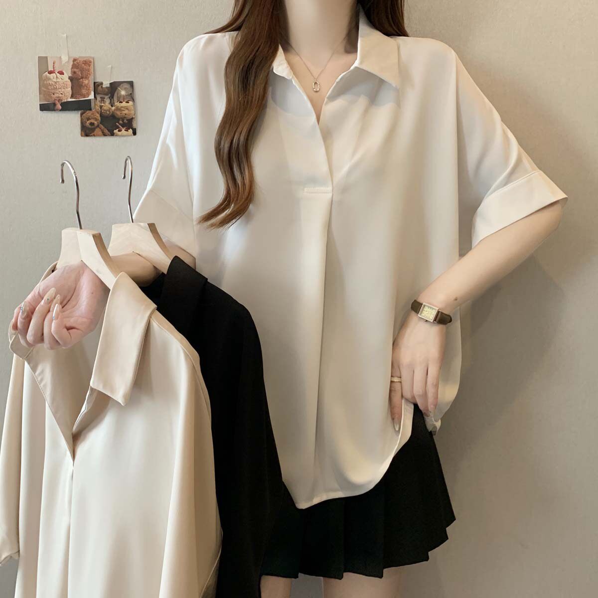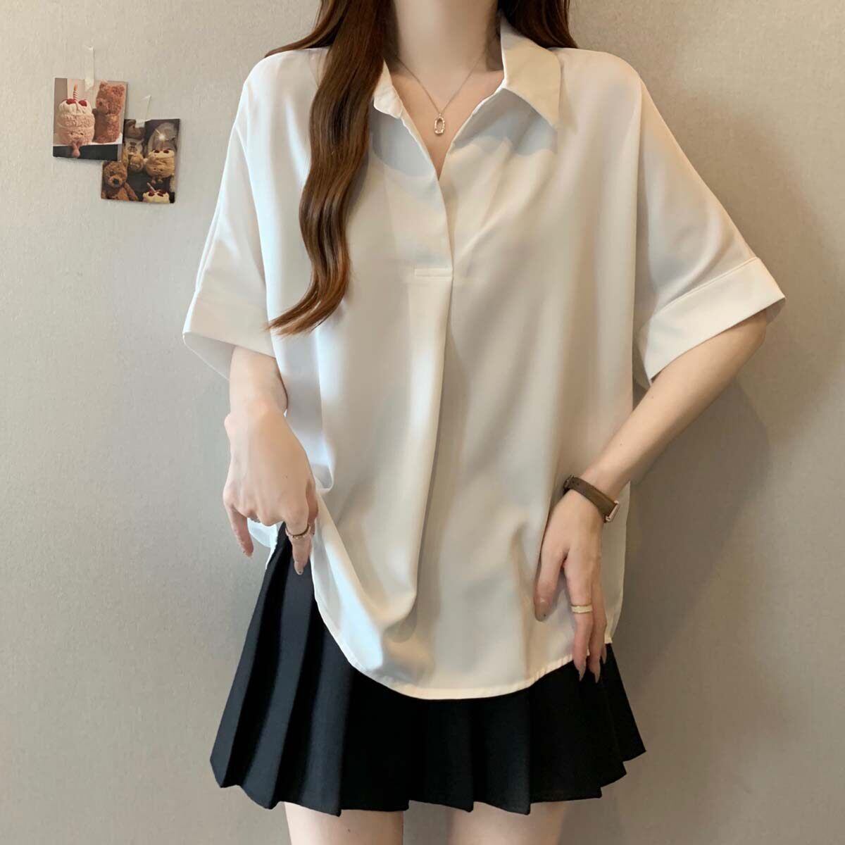 【送料無料】 レディース トップス シャツ ブラウス Vネック キーネック ゆったり シンプル カジュアル きれいめ 大人かわいい こなれ感 体型カバー 二の腕カバー スタイルアップ ベーシック 半袖 アイボリー ブラック カーキ 20代 30代 40代 通勤 通学 オフィス お出掛け 女子会 お呼ばれ 春夏