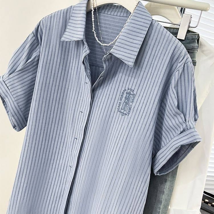 【送料無料】 レディース トップス シャツ ブラウス Vネック ストライプ サッカー シンプル カジュアル きれいめ 大人かわいい 体型カバー 二の腕カバー スタイルアップ こなれ感 半袖 ペールブルー ブルー ホワイト 20代 30代 40代 通勤 通学 オフィス お出掛け 女子会 お呼ばれ 春夏