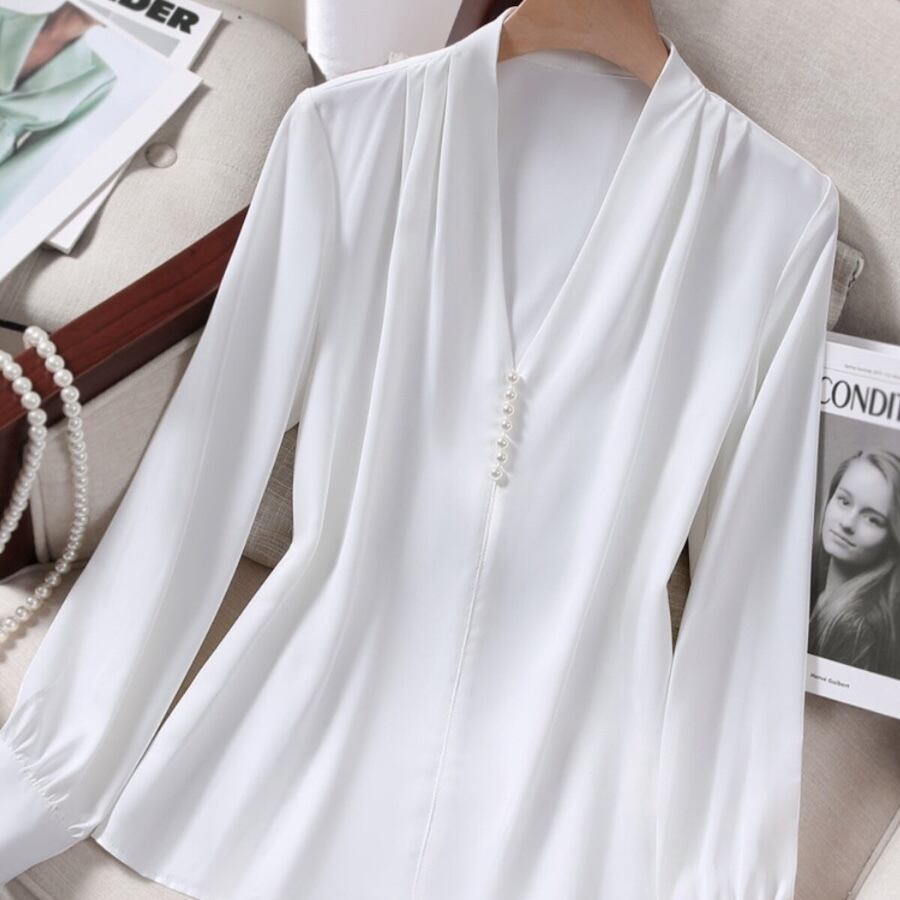 【送料無料】 レディース トップス ニシャツ ブラウス Vネック 上品 オケージョン シンプル カジュアル きれいめ 大人かわいい 体型カバー 二の腕カバー スタイルアップ ふんわり袖 長袖 ホワイト 20代 30代 40代 通勤 通学 オフィス お出掛け 女子会 お呼ばれ 春夏
