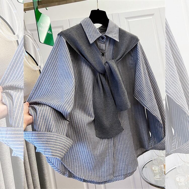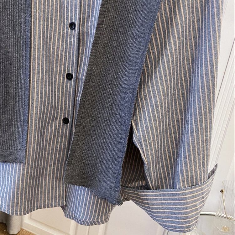 【送料無料】 レディース トップス ニット シャツ クルーネック フェイクレイヤード 重ね着風 カラー切り替え カラーブロック こなれ感 ストライプ ドッキング 素材組み合わせ シンプル カジュアル きれいめ 大人かわいい 体型カバー 二の腕カバー スタイルアップ 長袖 グレー 20代 30代 40代 通勤 通学 オフィス お出掛け 女子会 お呼ばれ 春夏