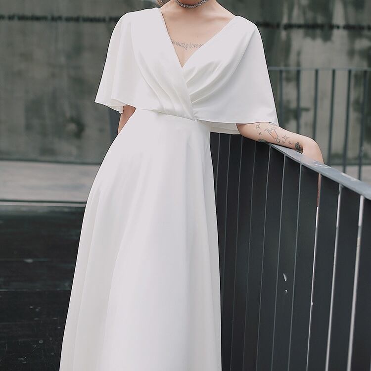 【送料無料】 レディース ドレス パーティードレス ワンピース Aライン Vネック ロング丈 マキシ丈 シンプル きれいめ 大人かわいい キュート レトロ こなれ感 体型カバー 二の腕カバー スタイルアップ 上品 半袖 ホワイト ブラック 結婚式 2次会 お呼ばれ パーティー お食事会 ディナー ランチ お出かけ 春夏