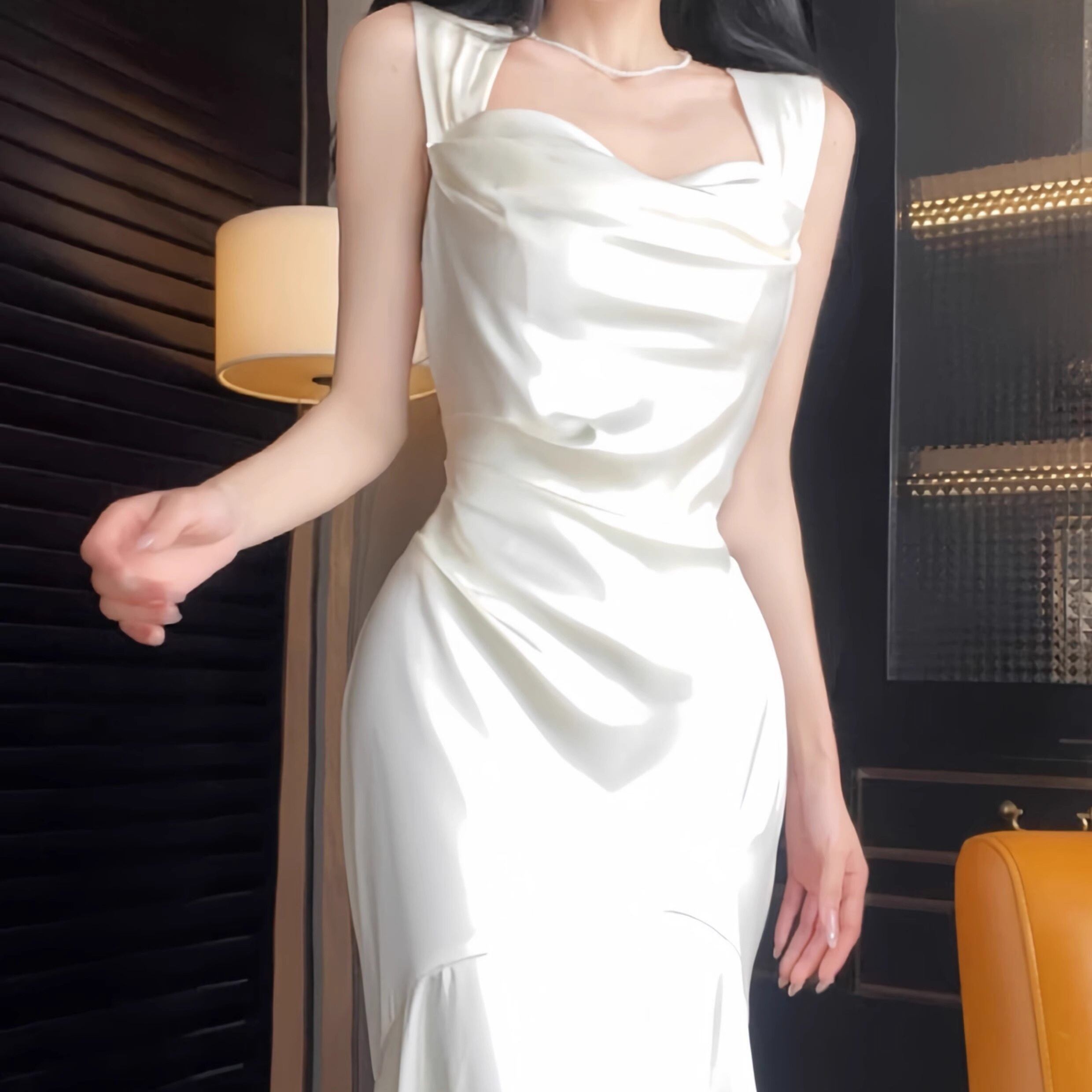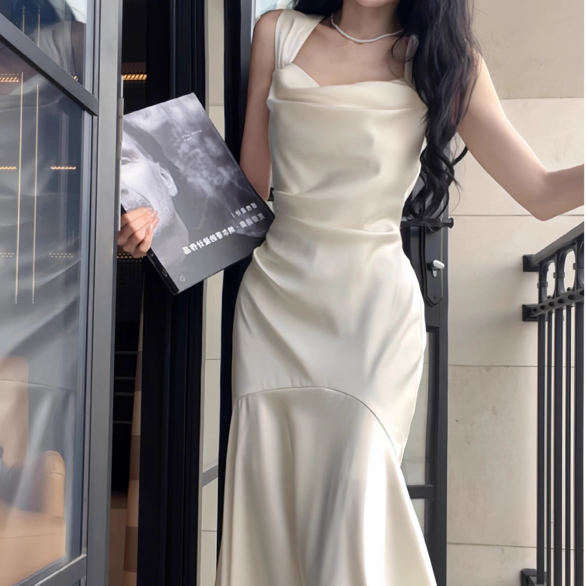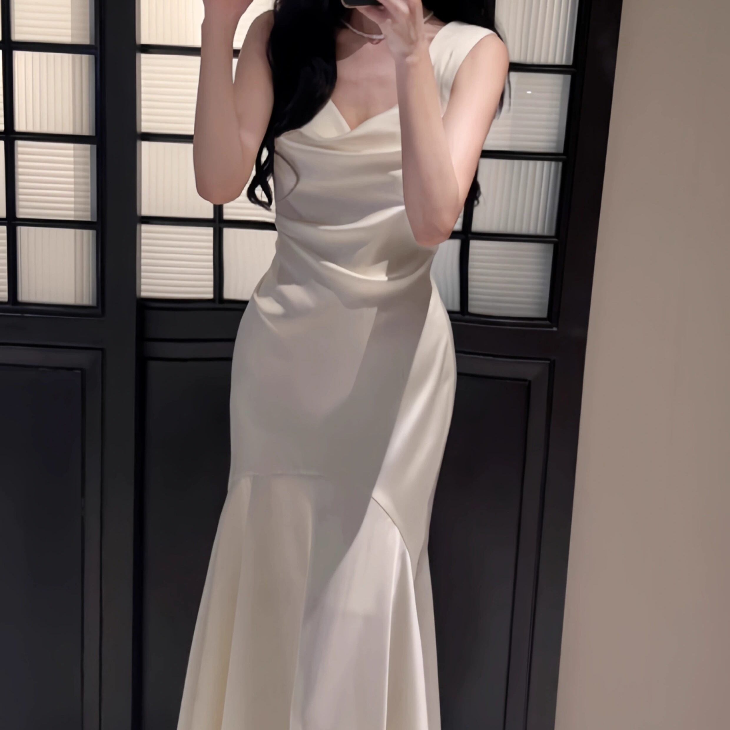 【送料無料】 レディース ドレス パーティードレス ワンピース Aライン スクエアネック ロング丈 マキシ丈 マーメイド シンプル きれいめ 大人かわいい キュート レトロ こなれ感 体型カバー スタイルアップ ノースリーブ ホワイト 結婚式 2次会 お呼ばれ パーティー お食事会 ディナー ランチ お出かけ 春夏
