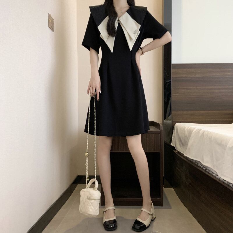 【送料無料】 レディース ドレス パーティードレス ワンピース Aライン クルーネック ミニ丈 ショート丈 シンプル きれいめ 大人かわいい キュート レトロ こなれ感 体型カバー 二の腕カバー スタイルアップ リボン カラー切り替え カラーブロック モノトーン 半袖 ブラック 結婚式 2次会 お呼ばれ パーティー お食事会 ディナー ランチ お出かけ 春夏
